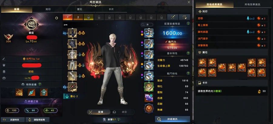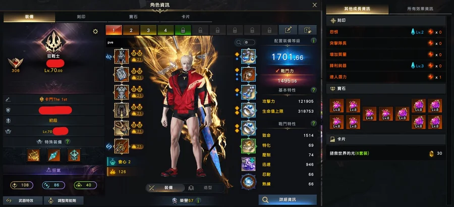1600男拳(紅拳歐拉):全身防具藍紫品/1套10等寶石/武器品94/石頭88/狗糧240W