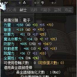 【%力劍士神秘鞋】職業:劍士星力: 17C主潛:27%力帶雙全屬附加:稀有(+8%力)