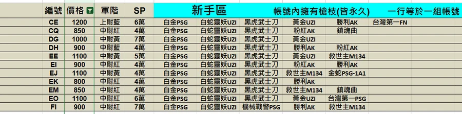 | 編號 | 價格 | 軍階 | SP | 新手區 帳號內擁有槍枝(皆永久) 一行等於一組帳號 | |||||||