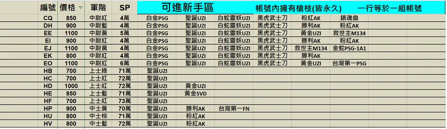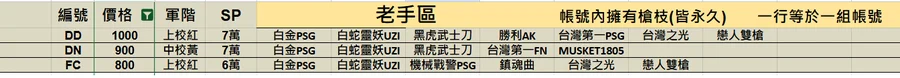 | 編號 | 價格 | 軍階 | SP | 老手區 帳號內擁有槍枝(皆永久) 一行等於一組帳號 | |||||||||