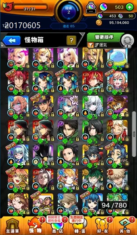 20170605---$1500__艾兒、正宗3、mv+新春+原路西法、八雲2、新春妮奧、千早、史萊姆1+2彈(缺紫苑)、五等分全齊、巨人兵長+米卡沙、我英4角色+453珠,遊玩次數1