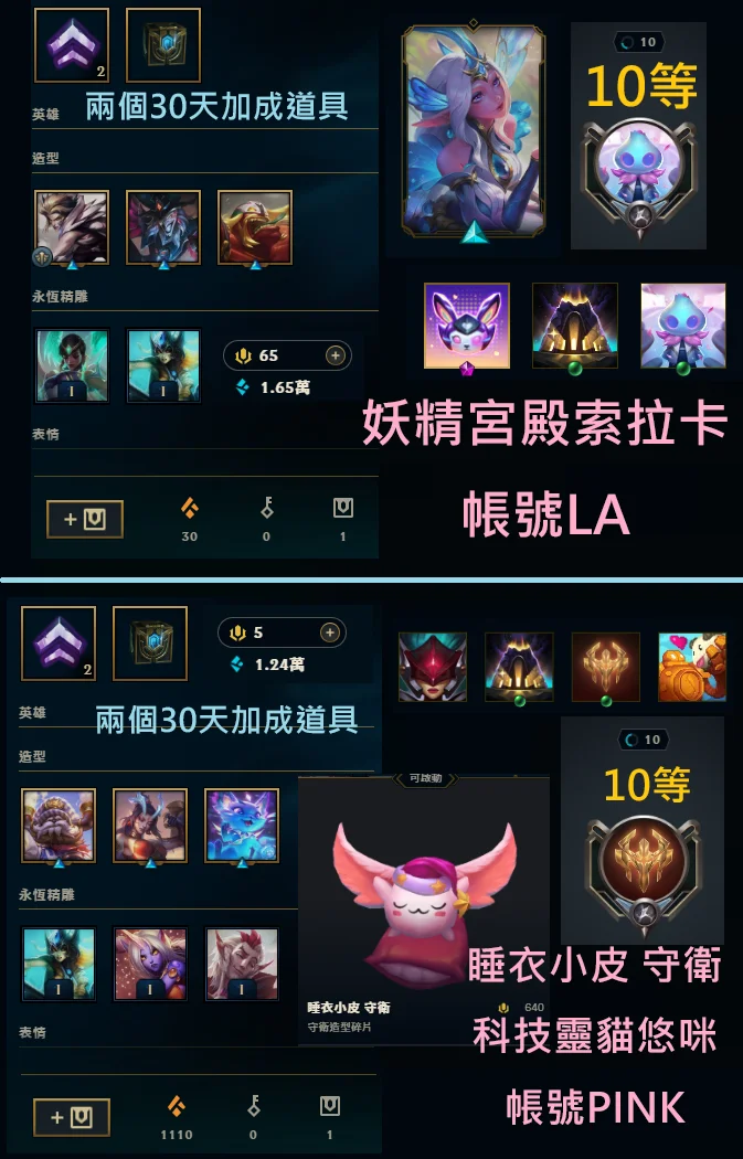 帳號LA→妖精宮殿索拉卡、有兩個加成道具、十等、99T