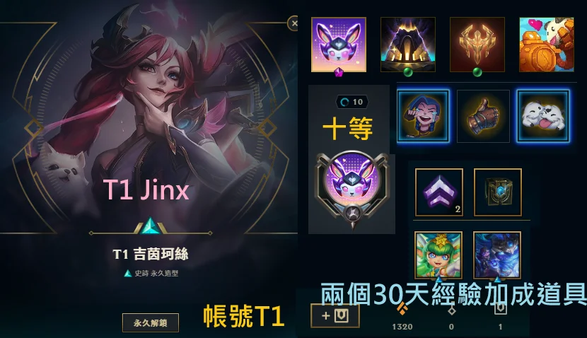 帳號T1→T1吉茵珂絲、兩個加成道具、十等、99T