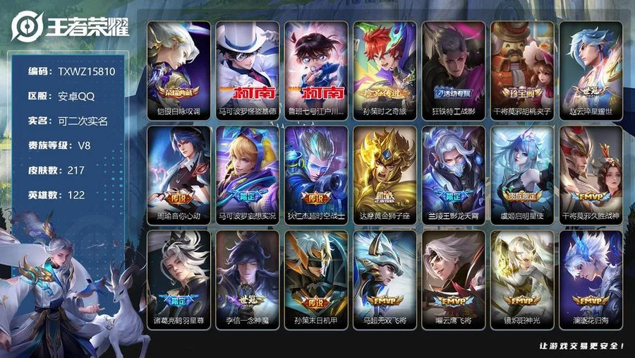 TXWZ15810-【商品標題】:安卓Q-V8-至尊星耀IV段位-122英雄-217造型-1典藏-0無雙-3珍品傳說-18傳說-63史詩 【榮耀典藏】:鎧銀白詠嘆調 【珍品傳說】:馬可波羅怪盜基德,魯班七號江戶川柯南,孫策時之奇旅 【內測造型】:狂鐵特工戰影,干將莫邪胡桃夾子 【傳說造型】:趙雲淬星耀世,周瑜音你心動,馬可波羅妄想實況,狄仁傑超時空戰士,達摩黃金獅子座,蘭陵王影龍天霄,虞姬啟明星使