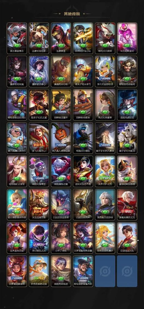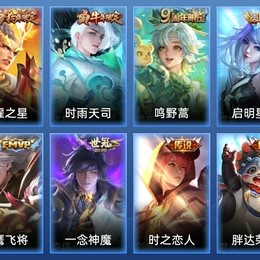 扁鵲-救世之瞳,鍾無豔-生化警戒,馬可波羅-激情綠茵,孫尚香-沉穩之力,嬴政-暗夜貴公子,馬超-倖存者,項羽-帝國元帥,劉禪-紳士熊喵,女媧-尼羅河女神,武則天-東方不敗,伽羅-箭羽風息,雅典娜-戰爭女神,姜子牙-時尚教父,金蟬-前塵,李白-千年之狐,后羿-阿爾法小隊,關羽-天啟騎士,嬴政-搖滾巨星,太乙真人-圓桌騎士,蔡文姬-薔薇王座,安琪拉-心靈駭客,劉禪-喚靈魔甲,哪吒-三太子,墨子-龍騎士,暃-碧珀緋影,阿古朵-熊喵少女,蔡文姬-舞動綠茵,李元芳-特種部隊,貂蟬-聖誕戀歌,宮本武藏-未來紀元,劉備-漢昭烈帝,亞瑟-心靈戰警,曹操-超能戰警,艾琳-流音漫舞,鍾無豔-聚星閃耀,亞連-破局者,張良-古海尋蹤,海月-王牌新星,狂鐵-特工戰影,小喬-繽紛獨角獸,墨子-金屬風暴,李元芳-妄想特派,呂布-聖誕狂歡,羋月-紅桃皇后,姬小滿-零食大作戰,蘭陵王-暗隱獵獸者,宮本武藏-鬼劍武藏,萊西奧-西部遊俠,太乙真人-勁辣紅鍋,豬八戒-年年有餘,牛魔-西部大鏢客,鏡-玫瑰異探,趙懷真-太極少年,蒙恬-蔚藍守將,西施-歸虛夢演,雲纓-赤焰之纓,白起-樂園追獵者,魯班七號-電玩小子,娜可露露-晚螢,露娜-紫霞仙子,百里守約-特工魅影,不知火舞-魅語,盾山-極冰防禦線,后羿-精靈王,狄仁傑-錦衣衛,高漸離-金屬狂潮,桑啟-畫中遊,上官婉兒-修竹墨客,劉邦-聖殿之光,李白-敏銳之力,明世隱-占星師,蒙犽-歸虛夢演,狂鐵-命運角鬥場,白起-白色死神,安琪拉-玩偶對對碰,伽羅-花見巫女,夢奇-美夢成真,小喬-萬聖前夜,妲己-女僕咖啡,王昭君-偶像歌手,甄姬-花好人間,周瑜-海軍大將,阿軻-節奏熱浪,曹操-幽靈船長,牛魔-牛運亨通,豬八戒-潮玩探月行,項羽-蒼穹之光,王昭君-精靈公主,虞姬-加勒比小姐,劉禪-天才門將,海月-幻泉霧影,趙雲-白執事,百里玄策-威尼斯狂歡,貂蟬-異域舞娘,劉備-潮玩造夢師,戈婭-危途狂花,蒙犽-胡桃狂想曲,程咬金-無雙福將,馬可波羅-潮玩牛仔,劉邦-虎嘯劍宗,米萊狄-契約魔法,典韋-鐵甲之心,楊玉環-霓裳曲,姜子牙-熾熱元素使,花木蘭-兔女郎,蒙恬-秩序獵龍將,魯班大師-乓乓大師,百里守約-絕影神槍,魯班大師-歸虛夢演,李白-範海辛,花木蘭-劍舞者,諸葛亮-掌控之力,孫臏-天使之翼,弈星-踏雪尋梅,盤古-重灌意志,張良-繽紛繪卷,李元芳-逐浪之夏,莊周-奇妙博物學,嫦娥-露花倒影,大喬-守護之力,露娜-瓷語鑑心,蘇烈-堅韌之力,老夫子-潮流仙人,張飛-亂世虎臣,劉邦-德古拉伯爵,楊戩-次元傲視,劉禪-秘密基地,司空震-啟蟄,公孫離-花間舞,雅典娜-冰冠公主,瀾-孤獵,項羽-科學大爆炸,甄姬-冰雪圓舞曲,米萊狄-精準探案法,劉禪-英喵野望,阿軻-暗夜貓娘,瑤-森,東皇太一-東海龍王,孫臏-未來旅行,鍾馗-地府判官,沈夢溪-棒球奇才,廉頗-無盡征程,鬼谷子-阿摩司公爵,孫策-貓狗日記,典韋-黃金武士,孫策-海之征途,曜-歸虛夢演,張良-一千零一夜,孫尚香-時之戀人,程咬金-功夫廚神,達摩-拳王,趙雲-忍·炎影,夏侯惇-乘風破浪,鎧-曙光守護者,盾山-圓桌騎士,諸葛亮-黃金分割率,司馬懿-魘語軍師,橘右京-修羅,趙雲-未來紀元,盤古-創世神祝,李信-灼熱之刃,狄仁傑-鷹眼統帥,達摩-大發明家,劉備-萬事如意,哪吒-次元突破,程咬金-星際陸戰隊,白起-星夜王子,沈夢溪-鯊炮海盜貓,孫臏-歸虛夢演,露娜-哥特玫瑰,張飛-五福同心,韓信-街頭霸王,呂布-野性能量,干將莫邪-第七人偶,孫尚香-水果甜心,小喬-丁香結,關羽-龍騰萬里,蘇烈-愛與和平,元歌-午夜歌劇院,宮本武藏-永珍初新,魯班七號-福祿兄弟,鎧-龍域領主,阿軻-愛心護理,明世隱-虹雲星官,楊戩-埃及法老,諸葛亮-星航指揮官,花木蘭-水晶獵龍者,安琪拉-如懿,裴擒虎-街頭旋風,大喬-伊勢巫女,鬼谷子-幻樂之宴,扁鵲-化身博士,宮本武藏-霸王丸,孫悟空-西部大鏢客,老夫子-功夫老勺,韓信-教廷特使,夏侯惇-戰爭騎士,鍾無豔-海灘麗影,妲己-魅力維加斯,蘭陵王-隱刃,劉備-紐約教父,黃忠-芝加哥教父,亞瑟-死亡騎士,妲己-少女阿狸