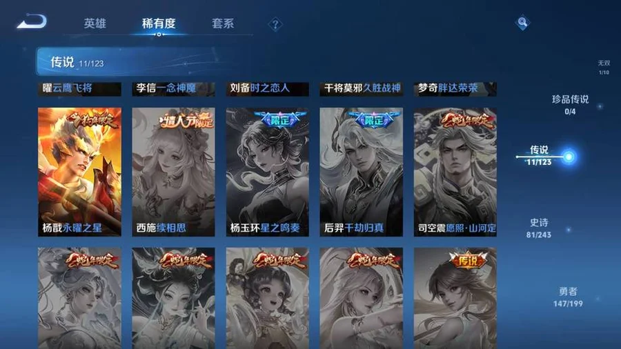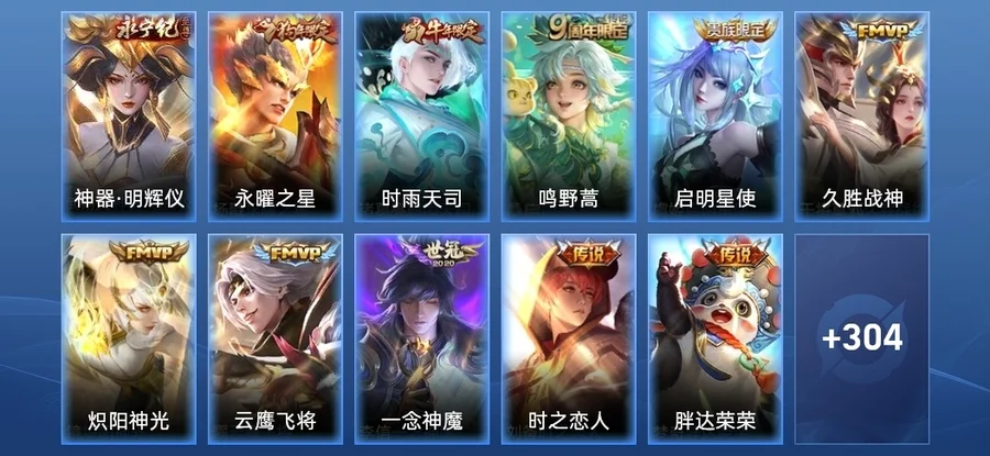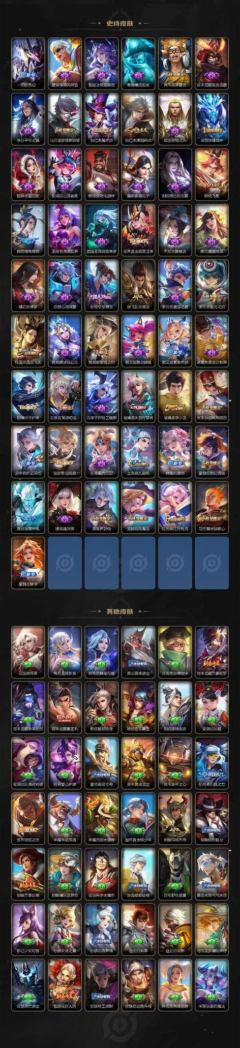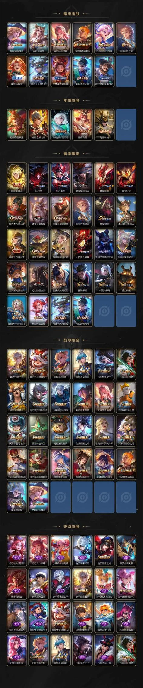 瀾-願照·九州拓,明世隱-景韶洛都,扁鵲-救世之瞳,鍾無豔-生化警戒,馬可波羅-激情綠茵,少司緣-靈卦秘語,孫尚香-沉穩之力,弈星-萬物之道,姜子牙-星夢巡禮,嬴政-暗夜貴公子,西施-雪境奇遇,太乙真人-謐流熔爐,典韋-鐵骨偃魂,蒼-蒼林狼騎,馬超-倖存者,項羽-帝國元帥,劉禪-紳士熊喵,干將莫邪-霧都夜雨,桑啟-鳴野蒿,女媧-尼羅河女神,武則天-東方不敗,東皇太一-噬滅天穹,伽羅-箭羽風息,楊玉環-遇見飛天,雅典娜-戰爭女神,姜子牙-時尚教父,金蟬-前塵,李白-千年之狐,后羿-阿爾法小隊,盤古-敬我三分,關羽-天啟騎士,程咬金-群星魔術團,嬴政-搖滾巨星,太乙真人-圓桌騎士,劉邦-劍破天穹,蔡文姬-薔薇王座,安琪拉-心靈駭客,劉禪-喚靈魔甲,扁鵲-無盡旅途,鍾無豔-春野之旅,沈夢溪-龍舞盛年,哪吒-三太子,百里玄策-原初追逐者,亞瑟-鴻運當頭,廉頗-功夫炙烤,墨子-龍騎士,暃-碧珀緋影,朵莉亞-金色潮汐,阿古朵-熊喵少女,嫦娥-漠中幻影,蔡文姬-舞動綠茵,李元芳-特種部隊,海諾-時空諜影,鬼谷子-天穹祈燈,貂蟬-聖誕戀歌,后羿-完美運算,蒙犽-百解令,司空震-地獄燃心,宮本武藏-未來紀元,劉備-漢昭烈帝,亞瑟-心靈戰警,曹操-超能戰警,韓信-傲雪梅槍,阿古朵-江河有靈,艾琳-流音漫舞,鍾無豔-聚星閃耀,亞連-破局者,張良-古海尋蹤,海月-王牌新星,狂鐵-特工戰影,小喬-繽紛獨角獸,戈婭-馭風魔法,墨子-金屬風暴,李元芳-妄想特派,呂布-聖誕狂歡,羋月-紅桃皇后,姬小滿-零食大作戰,魯班大師-探海日誌,蘭陵王-暗隱獵獸者,西施-玲瓏珍味,扁鵲-奇幻香蹤,鏡-熾陽神光,宮本武藏-鬼劍武藏,楊戩-潮玩騎兵,萊西奧-西部遊俠,太乙真人-勁辣紅鍋,艾琳-女武神,裴擒虎-擒濤扼浪,豬八戒-年年有餘,牛魔-西部大鏢客,鏡-玫瑰異探,趙懷真-太極少年,蒙恬-蔚藍守將,西施-歸虛夢演,雅典娜-黎明之約,高漸離-死亡搖滾,雲纓-赤焰之纓,白起-樂園追獵者,魯班七號-電玩小子,劉備-時之戀人,暃-星界遊俠,虞姬-啟明星使,娜可露露-晚螢,露娜-紫霞仙子,百里守約-特工魅影,不知火舞-魅語,盾山-極冰防禦線,后羿-精靈王,盤古-冰霜神祇,狄仁傑-錦衣衛,高漸離-金屬狂潮,嫦娥-暖冬·兔眠,桑啟-畫中遊,上官婉兒-修竹墨客,劉邦-聖殿之光,李白-敏銳之力,明世隱-占星師,韓信-飛衡,武則天-神器·明輝儀,蒙犽-歸虛夢演,狂鐵-命運角鬥場,白起-白色死神,安琪拉-玩偶對對碰,伽羅-花見巫女,夢奇-美夢成真,小喬-萬聖前夜,楊戩-永曜之星,妲己-女僕咖啡,王昭君-偶像歌手,甄姬-花好人間,周瑜-海軍大將,阿軻-節奏熱浪,曹操-幽靈船長,牛魔-牛運亨通,豬八戒-潮玩探月行,項羽-蒼穹之光,王昭君-精靈公主,虞姬-加勒比小姐,劉禪-天才門將,海月-幻泉霧影,桑啟-海鹽詩旅,趙雲-白執事,百里玄策-威尼斯狂歡,貂蟬-異域舞娘,元歌-無心,劉備-潮玩造夢師,李元芳-雲中旅人,戈婭-危途狂花,蒙犽-胡桃狂想曲,程咬金-無雙福將,沈夢溪-大漠名商,嫦娥-拒霜思,馬可波羅-潮玩牛仔,孫尚香-薔薇戀人,劉邦-虎嘯劍宗,米萊狄-契約魔法,典韋-鐵甲之心,楊玉環-霓裳曲,姜子牙-熾熱元素使,花木蘭-兔女郎,蒙恬-秩序獵龍將,魯班大師-乓乓大師,米萊狄-胡桃異想國,百里守約-絕影神槍,鍾馗-驅儺正儀,魯班大師-歸虛夢演,李白-範海辛,花木蘭-劍舞者,諸葛亮-掌控之力,孫臏-天使之翼,弈星-踏雪尋梅,關羽-冰鋒戰神,盤古-重灌意志,張良-繽紛繪卷,李元芳-逐浪之夏,達摩-星際陸戰隊,莊周-奇妙博物學,程咬金-演武奪籌,嫦娥-露花倒影,大喬-守護之力,諸葛亮-時雨天司,元歌-雲間偶戲,露娜-瓷語鑑心,蘇烈-堅韌之力,老夫子-潮流仙人,張飛-亂世虎臣,劉邦-德古拉伯爵,亞瑟-潮玩騎士王,楊戩-次元傲視,雲中君-纖雲弄巧,劉禪-秘密基地,狄仁傑-萬華元夜,司空震-啟蟄,公孫離-花間舞,雅典娜-冰冠公主,瀾-孤獵,蒙犽-狂想玩偶喵,項羽-科學大爆炸,甄姬-冰雪圓舞曲,米萊狄-精準探案法,劉禪-英喵野望,裴擒虎-李小龍,阿軻-暗夜貓娘,瑤-森,東皇太一-東海龍王,雅典娜-單詞大作戰,鬼谷子-原初探秘者,馬可波羅-暗影遊獵,孫臏-未來旅行,鍾馗-地府判官,沈夢溪-棒球奇才,廉頗-無盡征程,鬼谷子-阿摩司公爵,蔡文姬-繁星吟遊,孫策-貓狗日記,典韋-黃金武士,曜-雲鷹飛將,豬八戒-西部大鏢客,孫策-海之征途,老夫子-醍醐杖,李信-一念神魔,馬超-神威,曜-歸虛夢演,張良-一千零一夜,孫尚香-時之戀人,阿軻-迷蹤麗影,程咬金-功夫廚神,達摩-拳王,劉邦-奪寶奇兵,趙雲-忍·炎影,夏侯惇-乘風破浪,鎧-曙光守護者,盾山-圓桌騎士,諸葛亮-黃金分割率,夢奇-胖達榮榮,孫悟空-至尊寶,明世隱-疑決卦,司馬懿-魘語軍師,橘右京-修羅,趙雲-未來紀元,盤古-創世神祝,李信-灼熱之刃,蒼-維京掠奪者,狄仁傑-鷹眼統帥,李元芳-銀河之約,沈夢溪-星空之諾,達摩-大發明家,劉備-萬事如意,弈星-混沌棋,哪吒-次元突破,程咬金-星際陸戰隊,夏侯惇-朔風刀,干將莫邪-久勝戰神,白起-星夜王子,上官婉兒-梁祝,鍾馗-神蹟守衛,魯班七號-獅舞東方,沈夢溪-鯊炮海盜貓,孫臏-歸虛夢演,露娜-哥特玫瑰,狄仁傑-魔術師,典韋-藍色畫面警告,張飛-五福同心,盾山-御鑾,韓信-街頭霸王,呂布-野性能量,裴擒虎-天狼狩獵者,干將莫邪-第七人偶,孫尚香-水果甜心,小喬-丁香結,嬴政-白晝王子,關羽-龍騰萬里,蘇烈-愛與和平,牛魔-御旌,元歌-午夜歌劇院,女媧-朔望之暉,宮本武藏-永珍初新,魯班七號-福祿兄弟,鎧-龍域領主,趙雲-皇家上將,呂布-獵獸之王,阿軻-愛心護理,