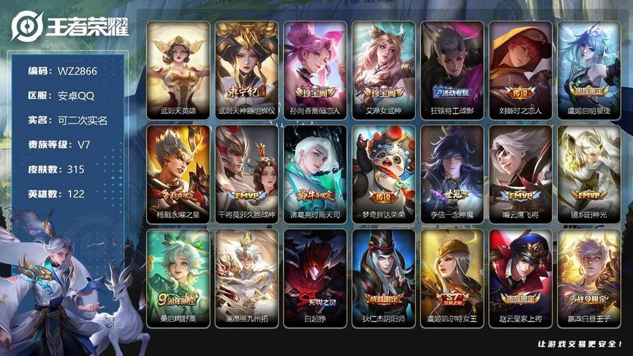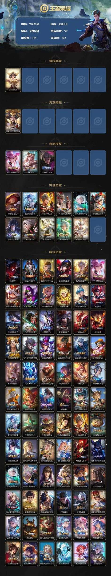 【商品標題】:安卓Q-V7-至尊星耀II段位-122英雄-315造型-1典藏-1無雙-0珍品傳說-11傳說-81史詩 【榮耀典藏】:武則天英雄 【無雙造型】:武則天神器明輝儀 【內測造型】:孫尚香薔薇戀人,艾琳女武神,狂鐵特工戰影 【傳說造型】:劉備時之戀人,虞姬啟明星使,楊戩永曜之星,干將莫邪久勝戰神,諸葛亮時雨天司,夢奇胖達榮榮,李信一念神魔,曜雲鷹飛將,鏡熾陽神光,桑啟鳴野蒿,瀾願照九州拓