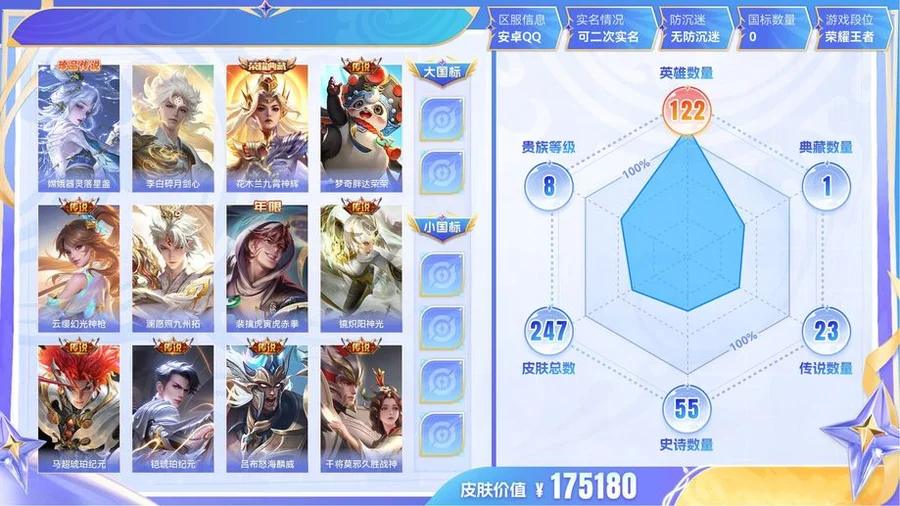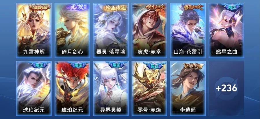 珍品傳說1 無雙1 典藏1 傳說23 史詩55 限定61 英雄122 造型247 貴族8級 【珍品傳說1】 嫦娥器靈落星盞 【無雙造型1】 李白碎月劍心 【榮耀典藏1】 花木蘭九霄神輝 【傳說造型23】 夢奇胖達榮榮 雲纓幻光神槍 瀾願照九州拓 裴擒虎寅虎赤拳 鏡熾陽神光 馬超琥珀紀元 鎧琥珀紀元 呂布怒海麟威 干將莫邪久勝戰神 虞姬啟明星使 花木蘭燃星之曲 曜山海蒼雷引 曜李逍遙 馬超無雙飛將