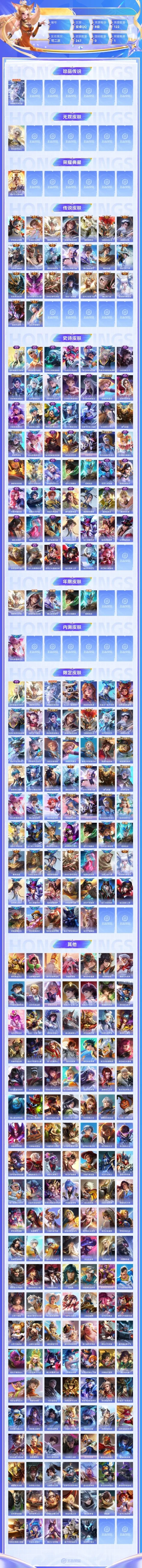 夢奇-胖達榮榮,典韋-黃金武士,達摩-爆裂喵拳,雲纓-幻光神槍,趙懷真-器靈·浮夢爐,瀾-願照·九州拓,嫦娥-器靈·落星盞,姜子牙-星夢巡禮,夏侯惇-乘風破浪,安琪拉-心靈駭客,太乙真人-謐流熔爐,西施-雪境奇遇,影-魅影綺裳,典韋-鐵骨偃魂,蒼-蒼林狼騎,廉頗-功夫炙烤,東皇太一-噬滅天穹,蘭陵王-暗隱獵獸者,李元芳-逐浪之夏,干將莫邪-霧都夜雨,后羿-完美運算,嫦娥-露花倒影,沈夢溪-龍舞盛年,蘇烈-愛與和平,羋月-紅桃皇后,張良-一千零一夜,露娜-瓷語鑑心,裴擒虎-寅虎·赤拳,百里玄策-原初追逐者,白起-星夜王子,高漸離-燃音魔法,妲己-靈卜魔法,盾山-圓桌騎士,關羽-龍騰萬里,鏡-熾陽神光,馬超-琥珀紀元,鎧-琥珀紀元,伽羅-琥珀紀元,李白-碎月劍心,鬼谷子-天穹祈燈,雲中君-纖雲弄巧,張良-古海尋蹤,孫臏-歸虛夢演,公孫離-無限星賞官,韓信-街頭霸王,呂布-怒海麟威,劉備-漢昭烈帝,鬼谷子-阿摩司公爵,趙雲-白執事,司馬懿-暗淵魔法,張飛-五福同心,哪吒-熱血海灘,李元芳-妄想特派,戈婭-馭風魔法,西施-歸虛夢演,鍾無豔-生化警戒,司馬懿-魘語軍師,狄仁傑-錦衣衛,米萊狄-精準探案法,姬小滿-零食大作戰,魯班大師-探海日誌,露娜-緋紅之刃,西施-玲瓏珍味,花木蘭-九霄神輝,黃忠-芝加哥教父,盾山-極冰防禦線,貂蟬-聖誕戀歌,王昭君-偶像歌手,扁鵲-奇幻香蹤,楊戩-潮玩騎兵,劉禪-電玩·爆裂旋風,太乙真人-圓桌騎士,花木蘭-默契交鋒,鬼谷子-幻樂之宴,上官婉兒-修竹墨客,劉邦-聖殿之光,萊西奧-西部遊俠,太乙真人-勁辣紅鍋,鍾馗-地府判官,劉禪-秘密基地,牛魔-西部大鏢客,干將莫邪-久勝戰神,裴擒虎-擒濤扼浪,雲中君-荷魯斯之眼,趙懷真-太極少年,蘇烈-堅韌之力,李白-敏銳之力,百里守約-特工魅影,沈夢溪-鯊炮海盜貓,諸葛亮-掌控之力,虞姬-啟明星使,扁鵲-化身博士,楊玉環-霓裳曲,花木蘭-燃星之曲,劉備-萬事如意,關羽-天啟騎士,蒼-維京掠奪者,豬八戒-潮玩探月行,白起-樂園追獵者,孫尚香-時之戀人,百里玄策-威尼斯狂歡,張飛-虎魄,暃-星界遊俠,弈星-踏雪尋梅,趙雲-忍·炎影,白起-白色死神,周瑜-海軍大將,孫尚香-薔薇戀人,曜-山海·蒼雷引,宮本武藏-鬼劍武藏,夢奇-美夢成真,呂布-末日機甲,達摩-拳王,牛魔-牛運亨通,裴擒虎-街頭旋風,明世隱-虹雲星官,海月-幻泉霧影,元歌-無心,桑啟-海鹽詩旅,項羽-帝國元帥,貂蟬-異域舞娘,嫦娥-暖冬·兔眠,張良-繽紛繪卷,老夫子-功夫老勺,姜子牙-熾熱元素使,李白-範海辛,鍾無豔-超時空戰士,后羿-精靈王,甄姬-落雪蘭心,馬超-倖存者,程咬金-無雙福將,孫尚香-水果甜心,廉頗-地獄巖魂,鬼谷子-五穀豐年,虞姬-加勒比小姐,雅典娜-冰冠公主,太乙真人-華麗搖滾,劉備-紐約教父,劉備-潮玩造夢師,馬可波羅-激情綠茵,小喬-丁香結,李元芳-雲中旅人,魯班大師-乓乓大師,鍾無豔-海灘麗影,花木蘭-瑞麟志,伽羅-花見巫女,蘭陵王-隱刃,花木蘭-劍舞者,高漸離-死亡搖滾,魯班七號-福祿兄弟,小喬-萬聖前夜,達摩-大發明家,蒙恬-蔚藍守將,曜-李逍遙,蒙犽-胡桃狂想曲,豬八戒-年年有餘,哪吒-次元突破,墨子-進擊墨子號,沈夢溪-大漠名商,老夫子-潮流仙人,鎧-青龍志,王昭君-精靈公主,馬超-無雙飛將,蔡文姬-薔薇王座,公孫離-花間舞,干將莫邪-第七人偶,劉禪-喚靈魔甲,蘭陵王-金庭之子,桑啟-畫中遊,程咬金-愛與正義,暃-碧珀緋影,孫策-末日機甲,司空震-啟蟄,亞瑟-心靈戰警,露娜-紫霞仙子,阿軻-節奏熱浪,宮本武藏-地獄之眼,鎧-曙光守護者,楊戩-天秀·啟明,娜可露露-晚螢,李信-一念神魔,女媧-尼羅河女神,韓信-傲雪梅槍,瀾-賞金獵手,孫悟空-零號·赤焰,諸葛亮-星航指揮官,夏洛特-永晝,花木蘭-冠軍飛將,韓信-教廷特使,曜-雲鷹飛將,東皇太一-東海龍王,橘右京-修羅,孫尚香-沉穩之力,明世隱-占星師,蒙犽-歸虛夢演,孫臏-天使之翼,鏡-冰刃幻境,劉邦-虎嘯劍宗,孫尚香-異界靈契,鏡-匿光追影者,沈夢溪-棒球奇才,達摩-沙漠行僧,宮本武藏-永珍初新,鎧-龍域領主,元歌-午夜歌劇院,狂鐵-特工戰影,墨子-金屬風暴,莊周-高山流水,夏侯惇-戰爭騎士,曹操-超能戰警,楊戩-埃及法老,狄仁傑-魔術師,甄姬-遊園驚夢,孫策-海之征途,雲纓-赤焰之纓,百里守約-絕影神槍,呂布-聖誕狂歡,盤古-創世神祝,孫悟空-孫行者,李元芳-特種部隊,蒙恬-秩序獵龍將,蘇烈-千軍破陣,呂布-野性能量,典韋-鐵甲之心,狄仁傑-陰陽師,趙雲-淬星耀世,狂鐵-命運角鬥場,李信-灼熱之刃,狄仁傑-鷹眼統帥,曜-歸虛夢演,花木蘭-水晶獵龍者,趙雲-皇家上將,瀾-孤獵,鎧-絳天戰甲,趙雲-未來紀元,鍾馗-驅儺正儀,項羽-海灘派對,花木蘭-兔女郎,孫悟空-西部大鏢客,程咬金-演武奪籌,孫臏-未來旅行,妲己-少女阿狸,姜子牙-時尚教父,妲己-魅力維加斯,鬼谷子-原初探秘者,老夫子-醍醐杖,亞瑟-死亡騎士