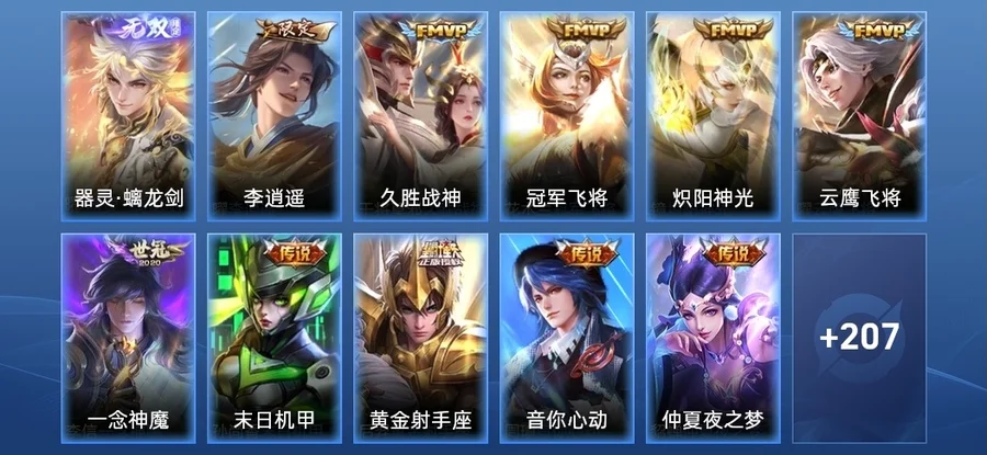 劉備-時之戀人,曜-雲鷹飛將,周瑜-音你心動,孫悟空-地獄火,鏡-熾陽神光,李信-一念神魔,貂蟬-仲夏夜之夢,干將莫邪-久勝戰神,后羿-黃金射手座,花木蘭-冠軍飛將,鎧-絳天戰甲,孫尚香-末日機甲