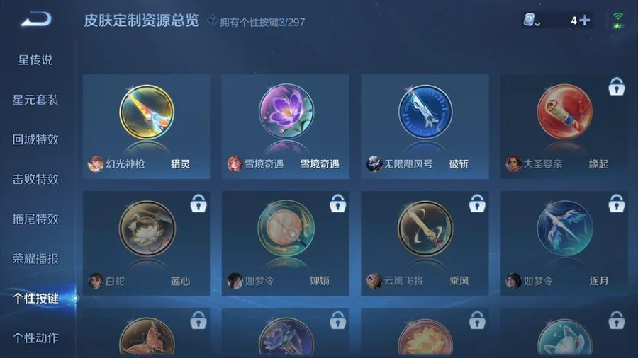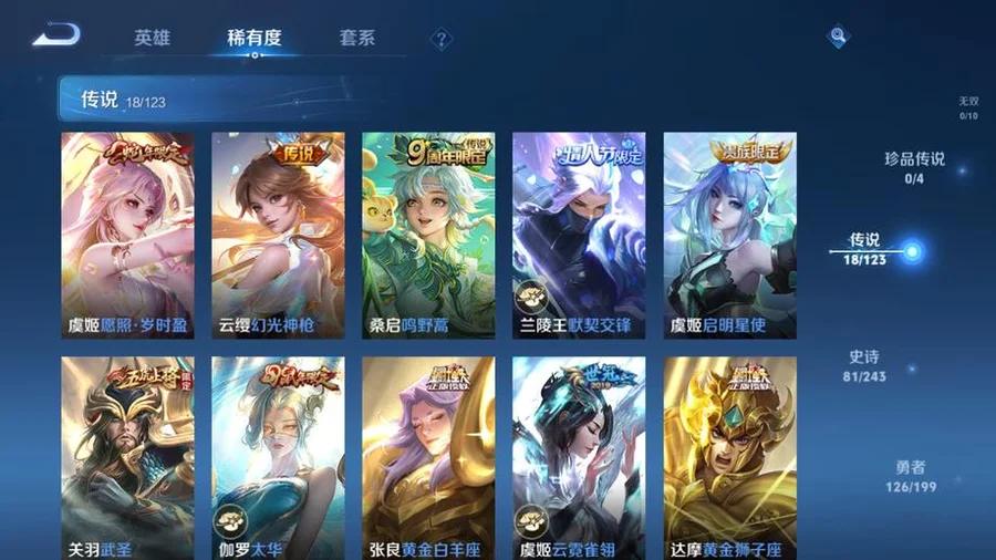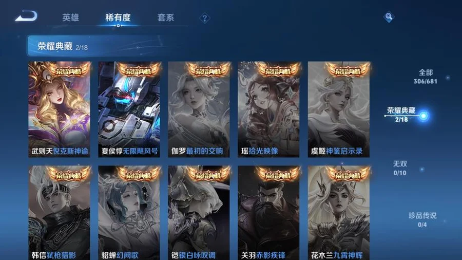 V9-2水晶1星元18傳說306造型武則天,倪克斯神諭,無限颶風號,金色仲夏夜,鳳求凰,白虎志,至尊寶,願照·歲時盈,幻光神槍,鳴野蒿,啟明星使,武聖,太華,雲霓雀翎,黃金獅子座,冠軍飛將,黃金射手座,黃金白羊座,武陵仙君,仲夏夜之夢,末日機甲(孫尚香),超時空戰士(狄仁傑),暗影遊獵,青龍志,鳳凰于飛,輝光之辰,幽恆,大聖娶親,一生所愛,冰霜戀舞曲,幽恆,逐夢之星,天狼繪夢者,藍色畫面警告,星空之諾