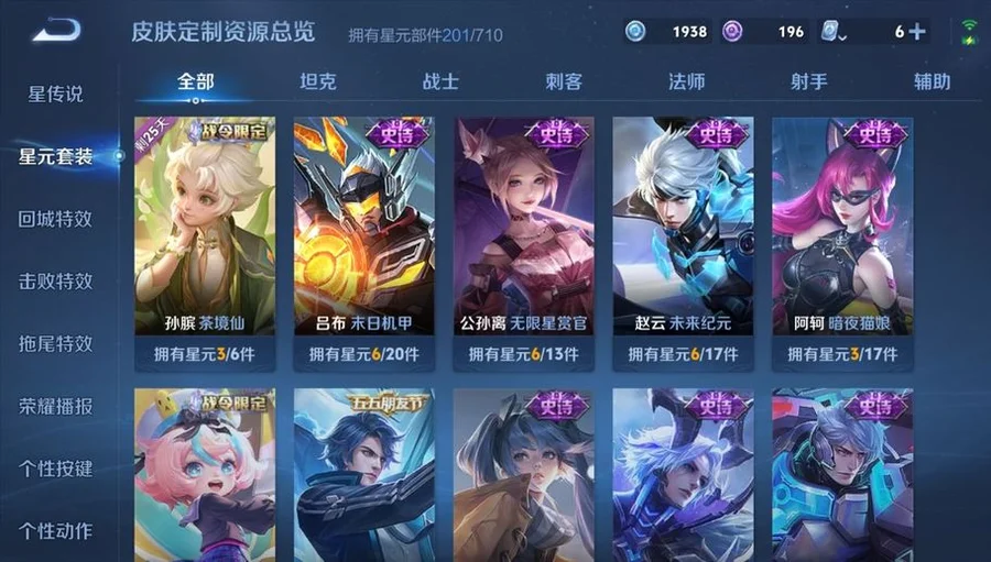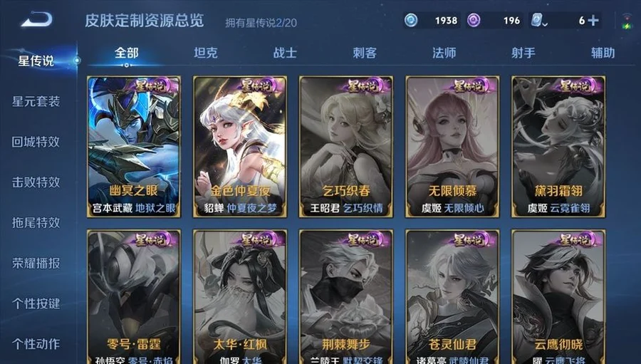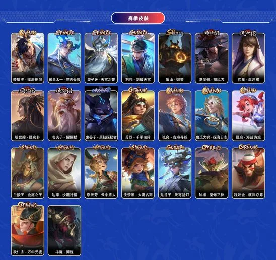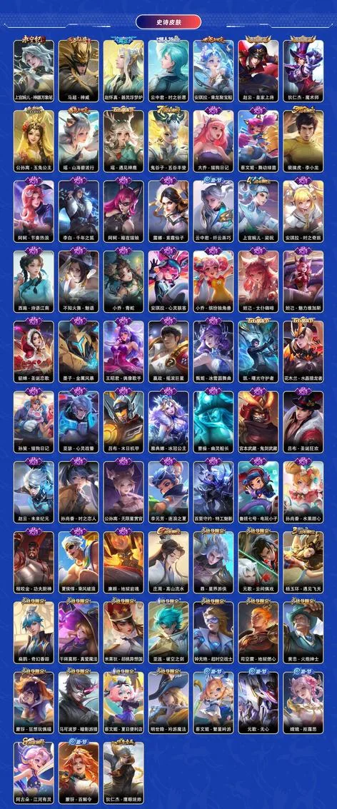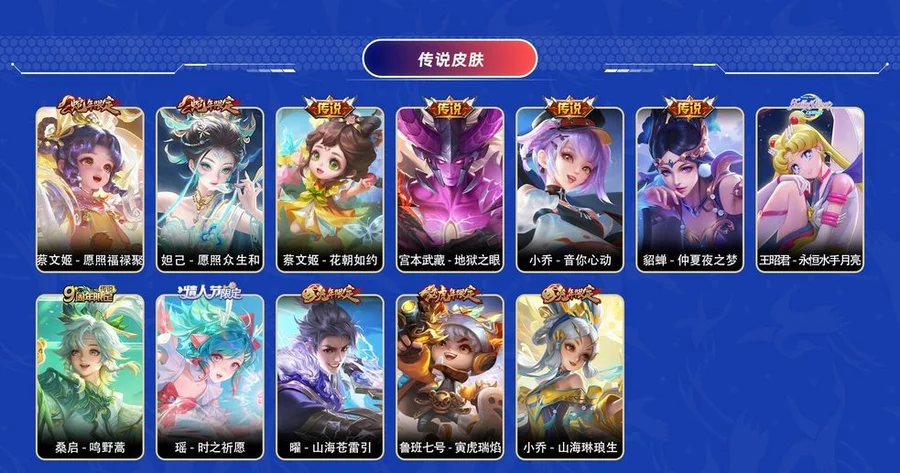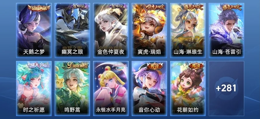 蔡文姬-願照·福祿聚,劉邦-德古拉伯爵,蒼-維京掠奪者,蒙犽-胡桃狂想曲,程咬金-功夫廚神,太乙真人-謐流熔爐,西施-詩語江南,妲己-願照·眾生和,李白-敏銳之力,趙懷真-器靈·浮夢爐,不知火舞-魅語,艾琳-女武神,姜子牙-星夢巡禮,廉頗-地獄巖魂,達摩-拳王,西施-雪境奇遇,馬超-訪茗客,孫臏-茶境仙,桑啟-鳴野蒿,干將莫邪-霧都夜雨,魯班七號-電玩小子,韓信-街頭霸王,小喬-青蛇,雅典娜-冰冠公主,亞瑟-心靈戰警,亞連-破空之劍,孫悟空-神蹟守衛,鎧-曙光守護者,東皇太一-噬滅天穹,孫臏-天使之翼,阿軻-節奏熱浪,狄仁傑-錦衣衛,虞姬-夏日便利店,蔡文姬-夏日便利店,李白-千年之狐,姜子牙-天穹之誓,安琪拉-時之奇旅,露娜-哥特玫瑰,周瑜-熔金海岸,大喬-絨語心約,項羽-帝國元帥,曹操-超能戰警,大司命-暗都幽影,程咬金-群星魔術團,太乙真人-圓桌騎士,蔡文姬-舞動綠茵,劉邦-劍破天穹,暃-碧珀緋影,安琪拉-乘龍·聚寶船,盤古-創世神祝,金蟬-前塵,朵莉亞-金色潮汐,廉頗-功夫炙烤,后羿-精靈王,公孫離-無限星賞官,嫦娥-漠中幻影,海諾-時空諜影,鬼谷子-天穹祈燈,雲中君-纖雲弄巧,李元芳-妄想特派,孫臏-未來旅行,后羿-完美運算,蒙犽-百解令,小喬-天鵝之夢,司空震-地獄燃心,甄姬-冰雪圓舞曲,王昭君-永恆水手月亮,狂鐵-命運角鬥場,小喬-繽紛獨角獸,阿古朵-江河有靈,西施-歸虛夢演,亞連-破局者,宮本武藏-未來紀元,鍾無豔-聚星閃耀,張良-古海尋蹤,海月-王牌新星,艾琳-流音漫舞,李元芳-特種部隊,狂鐵-特工戰影,夏侯惇-戰爭騎士,西施-玲瓏珍味,扁鵲-奇幻香蹤,姬小滿-零食大作戰,魯班大師-探海日誌,孫策-海之征途,楊玉環-霓裳曲,典韋-黃金武士,萊西奧-西部遊俠,太乙真人-勁辣紅鍋,鍾無豔-生化警戒,羋月-紅桃皇后,花木蘭-劍舞者,老夫子-潮流仙人,公孫離-花間舞,趙雲-忍·炎影,后羿-阿爾法小隊,裴擒虎-擒濤扼浪,楊戩-潮玩騎兵,蒙恬-蔚藍守將,暃-星界遊俠,趙懷真-太極少年,白起-樂園追獵者,曹操-幽靈船長,張飛-五福同心,扁鵲-救世之瞳,馬超-神威,蒙犽-歸虛夢演,上官婉兒-神器·永珍筆,宮本武藏-地獄之眼,弈星-踏雪尋梅,魯班大師-歸虛夢演,劉邦-聖殿之光,馬超-倖存者,裴擒虎-街頭旋風,白起-白色死神,曜-山海·蒼雷引,小喬-山海·琳琅生,瑤-山海·碧波行,高漸離-玩趣惡龍,牛魔-牛運亨通,周瑜-海軍大將,豬八戒-潮玩探月行,嫦娥-暖冬·兔眠,姜子牙-時尚教父,海月-幻泉霧影,桑啟-海鹽詩旅,夏侯惇-乘風破浪,鬼谷子-阿摩司公爵,孫臏-歸虛夢演,姜子牙-熾熱元素使,鍾無豔-超時空戰士,元歌-無心,甄姬-落雪蘭心,司空震-啟蟄,妲己-女僕咖啡,鬼谷子-五穀豐年,劉備-潮玩造夢師,李元芳-雲中旅人,沈夢溪-大漠名商,明世隱-吟遊魔法,蘇烈-愛與和平,宮本武藏-鬼劍武藏,曹操-死神來了,蘭陵王-金庭之子,瑤-時之祈願,桑啟-畫中遊,白起-夜都怪俠,程咬金-無雙福將,公孫離-玉兔公主,高漸離-金屬狂潮,蔡文姬-花朝如約,高漸離-死亡搖滾,呂布-聖誕狂歡,魯班七號-寅虎·瑞焰,雲中君-時之祈願,孫策-貓狗日記,黃忠-火炮紳士,安琪拉-心靈駭客,孫尚香-時之戀人,大喬-貓狗日記,阿軻-暗夜貓娘,狄仁傑-魔術師,嬴政-搖滾巨星,盾山-極冰防禦線,百里守約-特工魅影,劉邦-虎嘯劍宗,關羽-天啟騎士,小喬-丁香結,呂布-野性能量,李白-範海辛,豬八戒-年年有餘,花木蘭-水晶獵龍者,牛魔-西部大鏢客,羋月-幻夜卜夢,達摩-沙漠行僧,貂蟬-聖誕戀歌,米萊狄-精準探案法,馬可波羅-潮玩牛仔,嫦娥-拒霜思,趙雲-白執事,干將莫邪-真愛魔法,諸葛亮-掌控之力,鬼谷子-幻樂之宴,扁鵲-化身博士,夢奇-美夢成真,蒙恬-秩序獵龍將,牛魔-制霸全明星,孫尚香-沉穩之力,哪吒-三太子,莊周-高山流水,墨子-金屬風暴,楊玉環-遇見飛天,鍾馗-地府判官,妲己-紫羅蘭之誓,瀾-孤獵,嫦娥-露花倒影,劉禪-秘密基地,司馬懿-魘語軍師,孫尚香-薔薇戀人,蘇烈-千軍破陣,后羿-聖弓遊俠,鏡-冰刃幻境,鎧-龍域領主,宮本武藏-霸王丸,哪吒-次元突破,達摩-大發明家,魯班大師-乓乓大師,小喬-音你心動,鍾馗-驅儺正儀,孫悟空-西部大鏢客,雲纓-赤焰之纓,米萊狄-胡桃異想國,達摩-星際陸戰隊,虞姬-加勒比小姐,趙雲-皇家上將,張良-繽紛繪卷,元歌-雲間偶戲,莊周-奇妙博物學,王昭君-偶像歌手,諸葛亮-星航指揮官,程咬金-演武奪籌,沈夢溪-鯊炮海盜貓,蘇烈-堅韌之力,露娜-瓷語鑑心,干將莫邪-第七人偶,露娜-紫霞仙子,亞瑟-潮玩騎士王,宮本武藏-永珍初新,趙雲-未來紀元,蔡文姬-薔薇王座,楊戩-次元傲視,元歌-午夜歌劇院,狄仁傑-萬華元夜,貂蟬-異域舞娘,蒙犽-狂想玩偶喵,老夫子-功夫老勺,花木蘭-兔女郎,李元芳-逐浪之夏,裴擒虎-李小龍,沈夢溪-棒球奇才,雅典娜-單詞大作戰,鬼谷子-原初探秘者,項羽-海灘派對,貂蟬-仲夏夜之夢,瑤-遇見神鹿,蔡文姬-繁星吟遊,阿古朵-熊喵少女,馬可波羅-暗影遊獵,小喬-萬聖前夜,雅典娜-戰爭女神,上官婉兒-修竹墨客,王昭君-精靈公主,曜-歸虛夢演,豬八戒-西部大鏢客,老夫子-醍醐杖,韓信-教廷特使,雲中君-荷魯斯之眼,張良-一千零一夜,盾山-圓桌騎士,鍾無豔-海灘麗影,明世隱-疑決卦,狄仁傑-陰陽師,大喬-伊勢巫女,劉備-紐約教父,安琪拉-玩偶對對碰,伽羅-花見巫女,明世隱-占星師,魯班七號-福祿兄弟,魯班七號-黑桃隊長,大喬-守護之力,狄仁傑-鷹眼統帥,劉備-萬事如意,明世隱-虹雲星官,弈星-混沌棋,劉備-漢昭烈帝,百里守約-絕影神槍,夏侯惇-朔風刀,上官