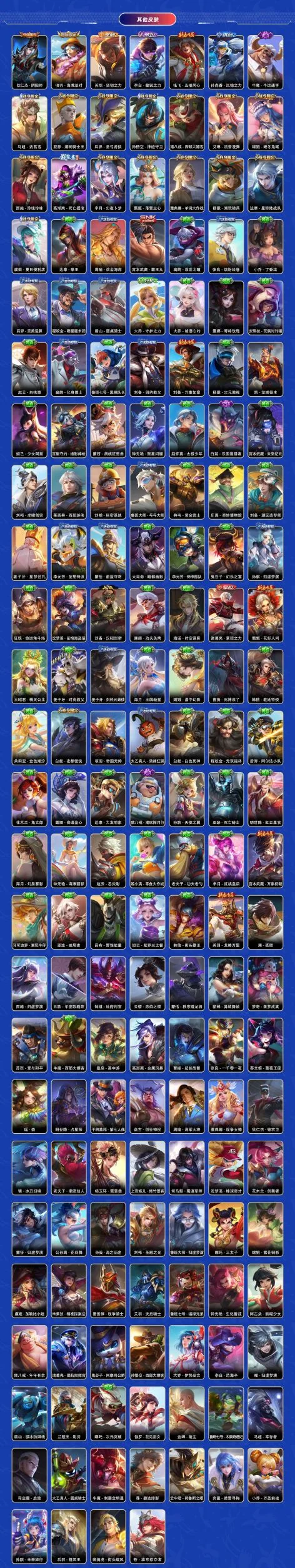 劉邦-德古拉伯爵,蒙犽-胡桃狂想曲,程咬金-功夫廚神,西施-詩語江南,李白-敏銳之力,不知火舞-魅語,廉頗-地獄巖魂,達摩-拳王,魯班七號-電玩小子,韓信-街頭霸王,小喬-青蛇,雅典娜-冰冠公主,亞瑟-心靈戰警,鎧-曙光守護者,孫臏-天使之翼,阿軻-節奏熱浪,狄仁傑-錦衣衛,李白-千年之狐,安琪拉-時之奇旅,露娜-哥特玫瑰,項羽-帝國元帥,曹操-超能戰警,太乙真人-圓桌騎士,蔡文姬-舞動綠茵,暃-碧珀緋影,盤古-創世神祝,金蟬-前塵,后羿-精靈王,公孫離-無限星賞官,李元芳-妄想特派,孫臏-未來旅行,甄姬-冰雪圓舞曲,狂鐵-命運角鬥場,小喬-繽紛獨角獸,西施-歸虛夢演,亞連-破局者,宮本武藏-未來紀元,鍾無豔-聚星閃耀,張良-古海尋蹤,海月-王牌新星,艾琳-流音漫舞,李元芳-特種部隊,狂鐵-特工戰影,夏侯惇-戰爭騎士,姬小滿-零食大作戰,孫策-海之征途,楊玉環-霓裳曲,典韋-黃金武士,萊西奧-西部遊俠,太乙真人-勁辣紅鍋,鍾無豔-生化警戒,羋月-紅桃皇后,花木蘭-劍舞者,老夫子-潮流仙人,公孫離-花間舞,趙雲-忍·炎影,后羿-阿爾法小隊,蒙恬-蔚藍守將,趙懷真-太極少年,白起-樂園追獵者,曹操-幽靈船長,張飛-五福同心,扁鵲-救世之瞳,蒙犽-歸虛夢演,弈星-踏雪尋梅,魯班大師-歸虛夢演,劉邦-聖殿之光,馬超-倖存者,裴擒虎-街頭旋風,白起-白色死神,牛魔-牛運亨通,周瑜-海軍大將,豬八戒-潮玩探月行,姜子牙-時尚教父,海月-幻泉霧影,夏侯惇-乘風破浪,鬼谷子-阿摩司公爵,孫臏-歸虛夢演,姜子牙-熾熱元素使,司空震-啟蟄,妲己-女僕咖啡,劉備-潮玩造夢師,蘇烈-愛與和平,宮本武藏-鬼劍武藏,曹操-死神來了,桑啟-畫中遊,程咬金-無雙福將,高漸離-金屬狂潮,呂布-聖誕狂歡,孫策-貓狗日記,安琪拉-心靈駭客,孫尚香-時之戀人,大喬-貓狗日記,阿軻-暗夜貓娘,嬴政-搖滾巨星,盾山-極冰防禦線,百里守約-特工魅影,劉邦-虎嘯劍宗,關羽-天啟騎士,小喬-丁香結,呂布-野性能量,李白-範海辛,豬八戒-年年有餘,花木蘭-水晶獵龍者,牛魔-西部大鏢客,貂蟬-聖誕戀歌,米萊狄-精準探案法,馬可波羅-潮玩牛仔,趙雲-白執事,諸葛亮-掌控之力,鬼谷子-幻樂之宴,扁鵲-化身博士,夢奇-美夢成真,蒙恬-秩序獵龍將,牛魔-制霸全明星,孫尚香-沉穩之力,哪吒-三太子,墨子-金屬風暴,鍾馗-地府判官,妲己-紫羅蘭之誓,瀾-孤獵,嫦娥-露花倒影,劉禪-秘密基地,司馬懿-魘語軍師,鏡-冰刃幻境,鎧-龍域領主,宮本武藏-霸王丸,哪吒-次元突破,達摩-大發明家,魯班大師-乓乓大師,孫悟空-西部大鏢客,雲纓-赤焰之纓,虞姬-加勒比小姐,張良-繽紛繪卷,莊周-奇妙博物學,王昭君-偶像歌手,諸葛亮-星航指揮官,沈夢溪-鯊炮海盜貓,蘇烈-堅韌之力,露娜-瓷語鑑心,干將莫邪-第七人偶,露娜-紫霞仙子,宮本武藏-永珍初新,趙雲-未來紀元,蔡文姬-薔薇王座,楊戩-次元傲視,元歌-午夜歌劇院,貂蟬-異域舞娘,老夫子-功夫老勺,花木蘭-兔女郎,李元芳-逐浪之夏,沈夢溪-棒球奇才,瑤-遇見神鹿,阿古朵-熊喵少女,小喬-萬聖前夜,雅典娜-戰爭女神,上官婉兒-修竹墨客,王昭君-精靈公主,曜-歸虛夢演,韓信-教廷特使,雲中君-荷魯斯之眼,張良-一千零一夜,盾山-圓桌騎士,鍾無豔-海灘麗影,大喬-伊勢巫女,劉備-紐約教父,安琪拉-玩偶對對碰,伽羅-花見巫女,明世隱-占星師,魯班七號-福祿兄弟,魯班七號-黑桃隊長,大喬-守護之力,狄仁傑-鷹眼統帥,劉備-萬事如意,明世隱-虹雲星官,劉備-漢昭烈帝,百里守約-絕影神槍,魯班七號-木偶奇遇記,妲己-魅力維加斯,蘭陵王-隱刃,孫尚香-水果甜心,甄姬-花好人間,瑤-森,關羽-龍騰萬里,妲己-少女阿狸,呂布-末日機甲,亞瑟-死亡騎士
