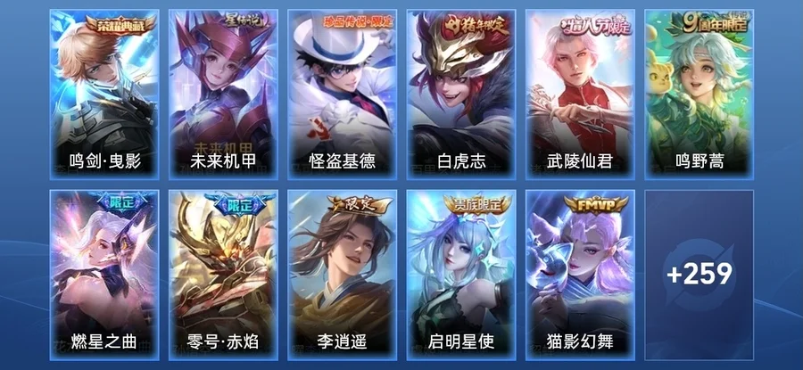 雲纓-幻光神槍,明世隱-景韶洛都,大喬-貓狗日記,趙懷真-器靈·浮夢爐,呂布-怒海麟威,瀾-願照·九州拓,弈星-萬物之道,貂蟬-聖誕戀歌,姜子牙-星夢巡禮,劉禪-紳士熊喵,馬超-訪茗客,孫臏-茶境仙,西施-雪境奇遇,牛魔-星界戰將,典韋-鐵骨偃魂,影-魅影綺裳,太乙真人-謐流熔爐,蒼-蒼林狼騎,李元芳-逐浪之夏,蒙恬-蔚藍守將,沈夢溪-月團寄思,白起-星夜王子,百里守約-百相守夢,老夫子-百相守夢,雅典娜-黎明之約,馬可波羅-怪盜基德,干將莫邪-霧都夜雨,桑啟-鳴野蒿,太乙真人-勁辣紅鍋,李白-敏銳之力,甄姬-遊園驚夢,明世隱-占星師,趙雲-未來紀元,東皇太一-噬滅天穹,金蟬-前塵,大司命-東方月初,曹操-超能戰警,諸葛亮-掌控之力,廉頗-功夫炙烤,趙雲-百木心槍,米萊狄-精準探案法,狂鐵-命運角鬥場,姜子牙-天穹之誓,曹操-決勝大滿貫,馬可波羅-逐夢之星,大司命-暗都幽影,張良-一千零一夜,劉邦-劍破天穹,張良-繽紛繪卷,嫦娥-露花倒影,沈夢溪-龍舞盛年,李元芳-特種部隊,鬼谷子-天穹祈燈,花木蘭-瑞麟志,盤古-創世神祝,狄仁傑-錦衣衛,張良-古海尋蹤,蘇烈-愛與和平,程咬金-無雙福將,司空震-啟蟄,弈星-踏雪尋梅,趙雲-忍·炎影,百里玄策-白虎志,阿古朵-江河有靈,牛魔-西部大鏢客,甄姬-冰雪圓舞曲,孫臏-天使之翼,桑啟-畫中遊,夏侯惇-戰爭騎士,李元芳-妄想特派,暃-碧珀緋影,鏡-熾陽神光,沈夢溪-匿光破解者,蘭陵王-暗隱獵獸者,西施-玲瓏珍味,魯班大師-探海日誌,老夫子-潮流仙人,高漸離-金屬狂潮,公孫離-記憶之芯,馬可波羅-激情綠茵,貂蟬-貓影幻舞,姬小滿-零食大作戰,宮本武藏-鬼劍武藏,公孫離-花間舞,楊戩-埃及法老,瀾-電玩·雷克斯,裴擒虎-擒濤扼浪,曹操-幽靈船長,豬八戒-潮玩探月行,花木蘭-燃星之曲,東皇太一-東海龍王,鬼谷子-五穀豐年,蘇烈-堅韌之力,李元芳-雲中旅人,達摩-大發明家,安琪拉-玩偶對對碰,沈夢溪-鯊炮海盜貓,狂鐵-特工戰影,曜-李逍遙,沈夢溪-大漠名商,瀾-賞金獵手,蔡文姬-薔薇王座,貂蟬-異域舞娘,米萊狄-契約魔法,雅典娜-戰爭女神,劉禪-秘密基地,劉禪-喚靈魔甲,孫尚香-薔薇戀人,鬼谷子-幻樂之宴,蘭陵王-金庭之子,李白-範海辛,瑤-森,程咬金-愛與正義,盾山-極冰防禦線,孫尚香-水果甜心,達摩-沙漠行僧,李信-一念神魔,姜子牙-時尚教父,莊周-高山流水,黃忠-芝加哥教父,鬼谷子-阿摩司公爵,百里守約-朱雀志,楊玉環-遇見飛天,花木蘭-劍舞者,雲纓-赤焰之纓,花木蘭-冠軍飛將,孫悟空-孫行者,曜-歸虛夢演,蘇烈-千軍破陣,老夫子-功夫老勺,扁鵲-化身博士,花木蘭-兔女郎,魯班大師-乓乓大師,鍾馗-驅儺正儀,李白-鳴劍·曳影,哪吒-三太子,程咬金-演武奪籌,司馬懿-魘語軍師,元歌-午夜歌劇院,百里玄策-熱力迴旋,莊周-奇妙博物學,蒼-維京掠奪者,魯班七號-電玩小子,王昭君-偶像歌手,哪吒-次元突破,王昭君-幻想奇妙夜,沈夢溪-星空之諾,元歌-雲間偶戲,亞瑟-潮玩騎士王,鏡-冰刃幻境,露娜-瓷語鑑心,張飛-亂世虎臣,孫悟空-零號·赤焰,趙雲-白執事,羋月-白晶晶,蒙犽-歸虛夢演,狄仁傑-萬華元夜,虞姬-啟明星使,瀾-孤獵,雲中君-纖雲弄巧,關羽-龍騰萬里,裴擒虎-李小龍,魯班大師-歸虛夢演,百里玄策-原初追逐者,姜子牙-熾熱元素使,百里守約-絕影神槍,鬼谷子-原初探秘者,亞瑟-心靈戰警,白起-白色死神,馬超-神威,狄仁傑-鷹眼統帥,老夫子-醍醐杖,墨子-金屬風暴,盾山-圓桌騎士,孫悟空-至尊寶,明世隱-疑決卦,馬超-倖存者,沈夢溪-棒球奇才,劉備-紐約教父,張良-黃金白羊座,夢奇-美夢成真,弈星-混沌棋,劉禪-英喵野望,張飛-五福同心,李信-灼熱之刃,雅典娜-冰冠公主,韓信-白龍吟,阿軻-節奏熱浪,干將莫邪-久勝戰神,曹操-死神來了,魯班七號-福祿兄弟,小喬-萬聖前夜,孫策-海之征途,羋月-紅桃皇后,達摩-拳王,蘭陵王-馴魔獵人,程咬金-星際陸戰隊,諸葛亮-武陵仙君,孫悟空-地獄火,伽羅-箭羽風息,明世隱-虹雲星官,呂布-聖誕狂歡,上官婉兒-梁祝,安琪拉-魔法小廚娘,夏侯惇-朔風刀,嬴政-暗夜貴公子,宮本武藏-地獄之眼,鍾無豔-海灘麗影,周瑜-赤蓮之焰,小喬-繽紛獨角獸,露娜-哥特玫瑰,孫尚香-末日機甲,百里守約-特工魅影,西施-歸虛夢演,公孫離-無限星賞官,達摩-黃金獅子座,伽羅-花見巫女,諸葛亮-黃金分割率,虞姬-雲霓雀翎,李白-千年之狐,露娜-緋紅之刃,雅典娜-神奇女俠,孫尚香-沉穩之力,魯班七號-獅舞東方,貂蟬-仲夏夜之夢,鍾馗-神蹟守衛,孫臏-歸虛夢演,甄姬-花好人間,妲己-少女阿狸,韓信-街頭霸王,韓信-教廷特使,狄仁傑-魔術師,盾山-御鑾,后羿-黃金射手座,鎧-曙光守護者,劉備-漢昭烈帝,呂布-野性能量,百里玄策-威尼斯狂歡,狄仁傑-陰陽師,裴擒虎-天狼狩獵者,典韋-藍色畫面警告,上官婉兒-修竹墨客,露娜-紫霞仙子,宮本武藏-永珍初新,諸葛亮-星航指揮官,小喬-丁香結,大喬-守護之力,牛魔-御旌,鍾馗-地府判官,女媧-朔望之暉,趙雲-皇家上將,花木蘭-水晶獵龍者,孫悟空-西部大鏢客,夏侯惇-乘風破浪,魯班七號-木偶奇遇記,米萊狄-御霄,項羽-海灘派對,干將莫邪-第七人偶,呂布-獵獸之王,露娜-一生所愛,馬超-無雙飛將,典韋-黃金武士,楊玉環-霓裳曲,桑啟-海鹽詩旅,李元芳-匿光偵查者,亞連-破局者,海月-王牌新星,阿古朵-熊喵少女,蒙恬-秩序獵龍將,未來機甲
