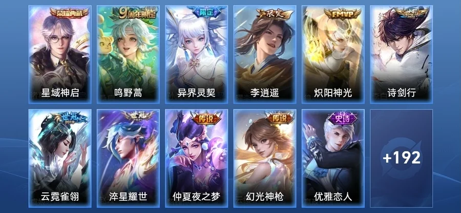 瀾-願照·九州拓,司馬懿-魘語軍師,狄仁傑-綺世丹青,羋月-紅桃皇后,明世隱-景韶洛都,雲纓-幻光神槍,海諾-時空諜影,少司緣-靈卦秘語,東皇太一-金福滿堂,趙懷真-器靈·浮夢爐,安琪拉-玩偶對對碰,太乙真人-謐流熔爐,諸葛亮-黃金分割率,姜子牙-星夢巡禮,西施-雪境奇遇,趙雲-未來紀元,典韋-鐵骨偃魂,蒼-蒼林狼騎,桑啟-鳴野蒿,張飛-亂世虎臣,阿古朵-熊喵少女,蘇烈-堅韌之力,干將莫邪-霧都夜雨,武則天-東方不敗,白起-星夜王子,艾琳-女武神,百里守約-特工魅影,魯班七號-電玩小子,東皇太一-噬滅天穹,盤古-敬我三分,呂布-聖誕狂歡,露娜-緋紅之刃,蒙恬-榮光聖徽,姜子牙-天穹之誓,李白-千年之狐,黃忠-怒海爭鋒,墨子-金屬風暴,程咬金-群星魔術團,扁鵲-救世之瞳,劉邦-劍破天穹,盤古-創世神祝,劉備-萬事如意,上官婉兒-修竹墨客,甄姬-花好人間,老夫子-功夫老勺,鏡-熾陽神光,明世隱-虹雲星官,沈夢溪-鯊炮海盜貓,劉禪-秘密基地,廉頗-功夫炙烤,哪吒-次元突破,沈夢溪-龍舞盛年,妲己-女僕咖啡,鬼谷子-天穹祈燈,夢奇-頑趣,后羿-完美運算,張良-古海尋蹤,程咬金-功夫廚神,李元芳-妄想特派,魯班大師-探海日誌,裴擒虎-擒濤扼浪,萊西奧-西部遊俠,太乙真人-勁辣紅鍋,暃-星界遊俠,白起-白色死神,趙懷真-太極少年,嫦娥-暖冬·兔眠,孫臏-未來旅行,黃忠-烈魂,甄姬-冰雪圓舞曲,蘭陵王-暗隱獵獸者,馬可波羅-山海·玄木吟,李白-詩劍行,嬴政-優雅戀人,豬八戒-潮玩探月行,桑啟-海鹽詩旅,海月-幻泉霧影,張良-繽紛繪卷,孫尚香-水果甜心,阿軻-節奏熱浪,甄姬-落雪蘭心,鍾無豔-超時空戰士,蔡文姬-舞動綠茵,鬼谷子-五穀豐年,姜子牙-熾熱元素使,李元芳-雲中旅人,戈婭-危途狂花,盾山-圓桌騎士,鬼谷子-幻樂之宴,嬴政-搖滾巨星,狂鐵-電玩高手,夢奇-美夢成真,宮本武藏-未來紀元,蒙恬-蔚藍守將,諸葛亮-掌控之力,典韋-黃金武士,劉備-漢昭烈帝,夏侯惇-乘風破浪,程咬金-無雙福將,明世隱-吟遊魔法,沈夢溪-大漠名商,王昭君-午後時光,大喬-伊勢巫女,周瑜-赤蓮之焰,蔡文姬-薔薇王座,關羽-龍騰萬里,鍾無豔-海灘麗影,米萊狄-契約魔法,宮本武藏-鬼劍武藏,劉禪-喚靈魔甲,百里守約-絕影神槍,蘭陵王-金庭之子,桑啟-畫中遊,白起-夜都怪俠,王昭君-幻想奇妙夜,扁鵲-化身博士,王昭君-精靈公主,諸葛亮-星域神啟,韓信-教廷特使,東皇太一-東海龍王,劉禪-英喵野望,露娜-一生所愛,劉邦-德古拉伯爵,亞瑟-心靈戰警,小喬-繽紛獨角獸,貂蟬-仲夏夜之夢,雅典娜-冰冠公主,劉邦-虎嘯劍宗,諸葛亮-星航指揮官,黃忠-火炮紳士,瀾-孤獵,李元芳-逐浪之夏,達摩-沙漠行僧,羋月-幻夜卜夢,花木蘭-青春決賽季,鏡-匿光追影者,馬可波羅-潮玩牛仔,蒙犽-龍鼓爭鳴,大喬-守護之力,花木蘭-水晶獵龍者,嫦娥-拒霜思,達摩-拳王,廉頗-地獄巖魂,黃忠-芝加哥教父,虞姬-雲霓雀翎,狂鐵-特工戰影,孫尚香-異界靈契,李元芳-特種部隊,牛魔-制霸全明星,伽羅-箭羽風息,莊周-高山流水,干將莫邪-真愛魔法,貂蟬-聖誕戀歌,馬超-神威,小喬-丁香結,公孫離-無限星賞官,豬八戒-豬悟能,狄仁傑-魔術師,呂布-末日機甲,妲己-紫羅蘭之誓,雲纓-赤焰之纓,安琪拉-時之奇旅,趙雲-淬星耀世,孫悟空-孫行者,曹操-幽靈船長,花木蘭-兔女郎,蘇烈-千軍破陣,后羿-聖弓遊俠,典韋-鐵甲之心,孫策-貓狗日記,劉備-紐約教父,曜-李逍遙,老夫子-航海奇遇記,墨子-神蹟守衛,張飛-五福同心,狄仁傑-陰陽師,趙雲-皇家上將,魯班大師-乓乓大師,孫尚香-時之戀人,鍾馗-驅儺正儀,狄仁傑-鷹眼統帥,露娜-哥特玫瑰,妲己-少女阿狸,孫臏-歸虛夢演,干將莫邪-第七人偶,李白-敏銳之力,程咬金-演武奪籌,老夫子-醍醐杖,豬八戒-西部大鏢客,鎧-曙光守護者,明世隱-疑決卦,項羽-海灘派對,豬八戒-年年有餘,孫悟空-至尊寶,后羿-阿爾法小隊,李信-灼熱之刃,魯班七號-黑桃隊長,弈星-混沌棋,妲己-魅力維加斯,盾山-御鑾,狄仁傑-錦衣衛,米萊狄-御霄,亞瑟-死亡騎士