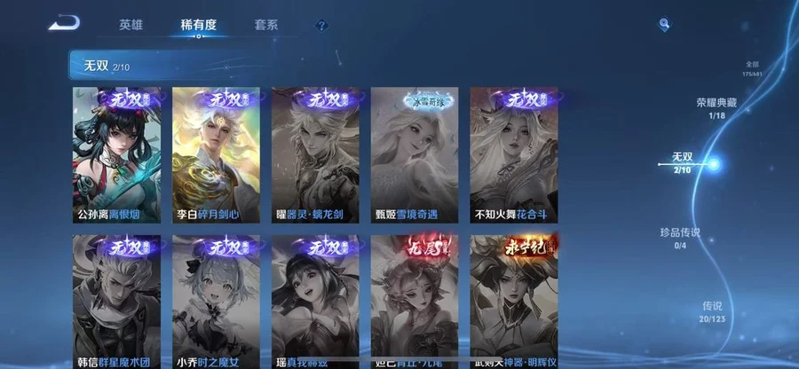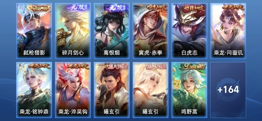 虞姬-啟明星使,鎧-冥王哈迪斯,后羿-無盡星芒,裴擒虎-寅虎·赤拳,呂布-曦玄引,貂蟬-曦玄引,趙雲-乘龍·銘鐘鼎,孫策-乘龍·淬吳鉤,孫尚香-乘龍·問璇璣,馬超-琥珀紀元,鎧-琥珀紀元,百里玄策-白虎志,夏洛特-浮生妄,不知火舞-緋月行