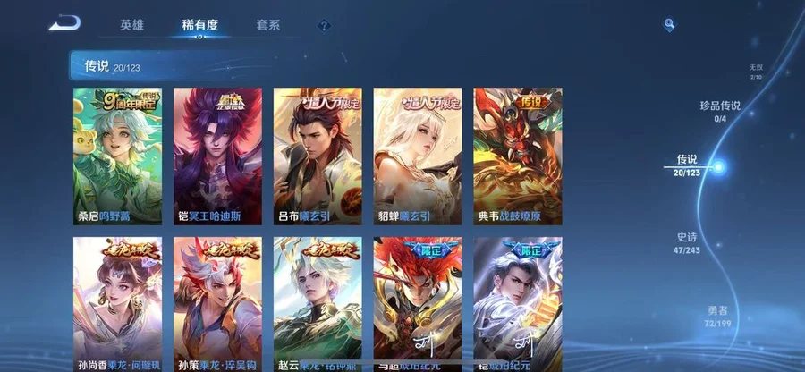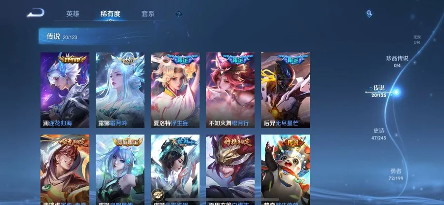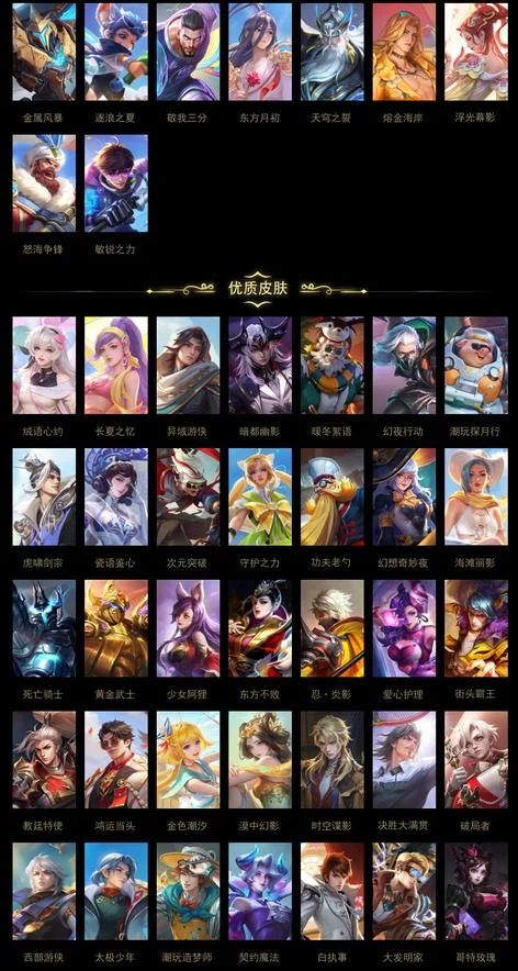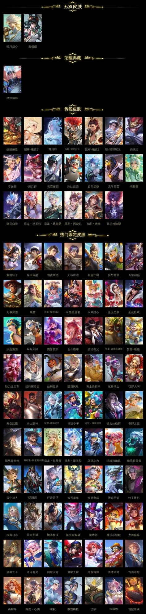 桑啟-鳴野蒿,武則天-東方不敗,小喬-繽紛獨角獸,上官婉兒-梁祝,嬴政-搖滾巨星,東皇太一-噬滅天穹,甄姬-花好人間,哪吒-次元突破,鍾無豔-海灘麗影,李元芳-逐浪之夏,米萊狄-精準探案法,盤古-敬我三分,典韋-黃金武士,伽羅-箭羽風息,蒙恬-秩序獵龍將,姬小滿-戰舞者,大司命-東方月初,魯班大師-乓乓大師,虞姬-啟明星使,米萊狄-契約魔法,女媧-尼羅河女神,蘭陵王-隱刃,公孫離-離恨煙,妲己-女僕咖啡,趙雲-忍·炎影,劉邦-虎嘯劍宗,哪吒-三太子,鎧-冥王哈迪斯,豬八戒-潮玩探月行,大喬-絨語心約,姜子牙-天穹之誓,鍾馗-地府判官,虞姬-雲霓雀翎,后羿-無盡星芒,牛魔-西部大鏢客,周瑜-熔金海岸,安琪拉-魔法小廚娘,豬八戒-年年有餘,宮本武藏-鬼劍武藏,羋月-浮光幕影,貂蟬-長夏之憶,劉備-異域遊俠,小喬-萬聖前夜,孫策-貓狗日記,楊玉環-霓裳曲,夢奇-胖達榮榮,諸葛亮-黃金分割率,黃忠-怒海爭鋒,大司命-暗都幽影,程咬金-群星魔術團,劉備-潮玩造夢師,趙雲-白執事,蒙犽-歸虛夢演,老夫子-功夫老勺,韓信-教廷特使,劉邦-劍破天穹,盤古-經緯探尋者,姜子牙-熾熱元素使,扁鵲-無盡旅途,鍾無豔-春野之旅,阿軻-愛心護理,沈夢溪-龍舞盛年,露娜-瓷語鑑心,韓信-弒槍獵影,司馬懿-魘語軍師,狂鐵-命運角鬥場,扁鵲-化身博士,裴擒虎-寅虎·赤拳,呂布-曦玄引,貂蟬-曦玄引,蘭陵王-暗隱獵獸者,魯班七號-電玩小子,典韋-戰鼓燎原,楊玉環-寅虎·心曲,娜可露露-晚螢,孫尚香-水果甜心,司空震-啟蟄,朵莉亞-金色潮汐,亞瑟-鴻運當頭,大喬-乘龍·憶丹青,安琪拉-乘龍·聚寶船,趙雲-乘龍·銘鐘鼎,孫策-乘龍·淬吳鉤,孫尚香-乘龍·問璇璣,孫悟空-西部大鏢客,馬超-琥珀紀元,姬小滿-妄想食味,廉頗-地獄巖魂,伽羅-琥珀紀元,鎧-琥珀紀元,瀾-逐花歸海,嫦娥-漠中幻影,李白-碎月劍心,程咬金-功夫廚神,雲纓-赤焰之纓,海諾-時空諜影,鬼谷子-天穹祈燈,雲中君-纖雲弄巧,蒙恬-榮光聖徽,周瑜-雪夜綺願,程咬金-暖冬絮語,后羿-完美運算,嫦娥-拒霜思,裴擒虎-街頭旋風,蒙犽-百解令,劉備-紐約教父,上官婉兒-修竹墨客,諸葛亮-星航指揮官,百里玄策-白虎志,孫策-海之征途,呂布-聖誕狂歡,露娜-霜月吟,夢奇-頑趣,王昭君-幻想奇妙夜,虞姬-加勒比小姐,干將莫邪-第七人偶,李白-敏銳之力,劉邦-德古拉伯爵,蘇烈-愛與和平,曹操-超能戰警,百里玄策-威尼斯狂歡,曹操-決勝大滿貫,狄仁傑-魔術師,韓信-傲雪梅槍,蘭陵王-幻夜行動,阿古朵-江河有靈,貂蟬-聖誕戀歌,魯班七號-木偶奇遇記,張良-古海尋蹤,亞連-破局者,狂鐵-特工戰影,公孫離-花間舞,哪吒-熱血海灘,墨子-金屬風暴,李元芳-妄想特派,沈夢溪-匿光破解者,妲己-少女阿狸,伽羅-花見巫女,魯班大師-探海日誌,黃忠-芝加哥教父,劉備-萬事如意,劉禪-電玩·爆裂旋風,花木蘭-水晶獵龍者,百里守約-絕影神槍,王昭君-偶像歌手,萊西奧-西部遊俠,太乙真人-勁辣紅鍋,姜子牙-時尚教父,裴擒虎-擒濤扼浪,大喬-守護之力,明世隱-占星師,趙懷真-太極少年,蒙恬-蔚藍守將,夏洛特-浮生妄,桑啟-海鹽詩旅,馬可波羅-激情綠茵,宮本武藏-永珍初新,李信-灼熱之刃,趙雲-皇家上將,蒼-維京掠奪者,孫尚香-沉穩之力,典韋-岱宗,不知火舞-緋月行,鬼谷子-五穀豐年,李元芳-雲中旅人,項羽-海灘派對,露娜-紫霞仙子,蘭陵王-金庭之子,瀾-孤獵,韓信-街頭霸王,露娜-哥特玫瑰,妲己-魅力維加斯,達摩-大發明家,狄仁傑-陰陽師,亞瑟-死亡騎士