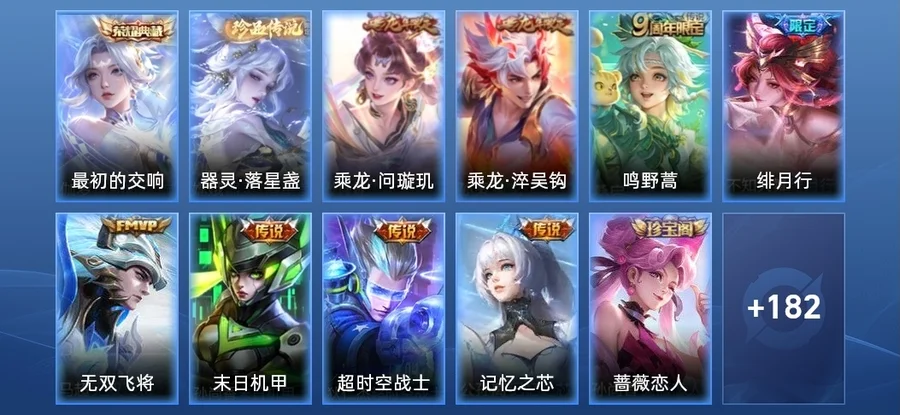 姬小滿-妄想食味,上官婉兒-梁祝,蒙恬-榮光聖徽,蒙犽-百解令,阿古朵-江河有靈,狄仁傑-魔術師,黃忠-火炮紳士,暃-星界遊俠,孫尚香-薔薇戀人,馬可波羅-山海·玄木吟,趙雲-皇家上將,夢奇-頑趣,元歌-無心,鬼谷子-五穀豐年,雅典娜-黎明之約,莊周-高山流水,裴擒虎-李小龍,百里玄策-原初追逐者,蔡文姬-繁星吟遊,馬可波羅-暗影遊獵,鍾無豔-王者之錘