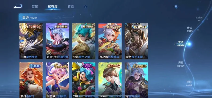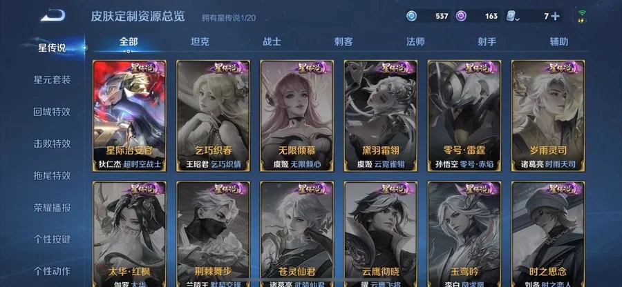 劉邦-德古拉伯爵,露娜-哥特玫瑰,瑤-森,金蟬-前塵,后羿-精靈王,女媧-尼羅河女神,太乙真人-圓桌騎士,孫臏-未來旅行,小喬-萬聖前夜,伽羅-最初的交響,魯班七號-木偶奇遇記,嫦娥-器靈·落星盞,馬超-無雙飛將,姜子牙-星夢巡禮,東皇太一-金福滿堂,西施-雪境奇遇,孫策-貓狗日記,羋月-紅桃皇后,牛魔-星界戰將,典韋-鐵骨偃魂,影-魅影綺裳,老夫子-百相守夢,百里守約-百相守夢,太乙真人-謐流熔爐,蒼-蒼林狼騎,阿古朵-熊喵少女,姬小滿-妄想食味,桑啟-鳴野蒿,上官婉兒-梁祝,劉禪-紳士熊喵,李白-千年之狐,亞瑟-動物派對,亞連-破空之劍,孫悟空-神蹟守衛,宮本武藏-鬼劍武藏,東皇太一-噬滅天穹,廉頗-地獄巖魂,扁鵲-救世之瞳,沈夢溪-棒球奇才,桑啟-畫中遊,甄姬-冰雪圓舞曲,周瑜-熔金海岸,姜子牙-天穹之誓,趙雲-白執事,劉邦-劍破天穹,孫尚香-乘龍·問璇璣,哪吒-次元突破,沈夢溪-龍舞盛年,阿軻-愛心護理,姜子牙-熾熱元素使,趙雲-忍·炎影,孫策-乘龍·淬吳鉤,花木蘭-水晶獵龍者,廉頗-功夫炙烤,蒙恬-榮光聖徽,東皇太一-東海龍王,鬼谷子-天穹祈燈,蒙犽-百解令,趙雲-未來紀元,阿古朵-江河有靈,張良-古海尋蹤,韓信-街頭霸王,墨子-金屬風暴,張飛-亂世虎臣,李元芳-妄想特派,魯班大師-探海日誌,魯班七號-福祿兄弟,劉禪-電玩·爆裂旋風,劉備-萬事如意,程咬金-無雙福將,雅典娜-戰爭女神,萊西奧-西部遊俠,公孫離-記憶之芯,狄仁傑-魔術師,裴擒虎-擒濤扼浪,牛魔-西部大鏢客,黃忠-火炮紳士,大喬-伊勢巫女,蒙恬-蔚藍守將,暃-星界遊俠,諸葛亮-掌控之力,孫尚香-末日機甲,弈星-踏雪尋梅,豬八戒-潮玩探月行,高漸離-死亡搖滾,阿軻-節奏熱浪,司空震-啟蟄,孫尚香-薔薇戀人,馬可波羅-山海·玄木吟,海月-幻泉霧影,趙雲-皇家上將,嫦娥-暖冬·兔眠,桑啟-海鹽詩旅,夢奇-頑趣,元歌-無心,李白-範海辛,馬超-倖存者,鬼谷子-幻樂之宴,鬼谷子-五穀豐年,不知火舞-緋月行,露娜-紫霞仙子,鍾馗-地府判官,明世隱-虹雲星官,李元芳-雲中旅人,戈婭-危途狂花,花木蘭-兔女郎,劉禪-英喵野望,楊玉環-霓裳曲,艾琳-奇遇舞章,貂蟬-異域舞娘,關羽-天啟騎士,魯班大師-歸虛夢演,李元芳-特種部隊,公孫離-花間舞,司馬懿-魘語軍師,沈夢溪-大漠名商,蘭陵王-金庭之子,狄仁傑-超時空戰士,項羽-海灘派對,馬可波羅-激情綠茵,虞姬-加勒比小姐,孫尚香-沉穩之力,劉禪-天才門將,小喬-丁香結,楊戩-埃及法老,白起-星夜王子,雅典娜-黎明之約,白起-白色死神,達摩-沙漠行僧,李元芳-逐浪之夏,伽羅-箭羽風息,狂鐵-特工戰影,沈夢溪-鯊炮海盜貓,劉備-漢昭烈帝,莊周-高山流水,娜可露露-晚螢,蘇烈-堅韌之力,大喬-守護之力,蘇烈-千軍破陣,扁鵲-化身博士,艾琳-女武神,百里守約-絕影神槍,魯班大師-乓乓大師,鍾馗-驅儺正儀,蘭陵王-暗隱獵獸者,雲纓-赤焰之纓,鏡-冰刃幻境,劉禪-秘密基地,孫臏-天使之翼,張良-繽紛繪卷,程咬金-演武奪籌,韓信-教廷特使,狄仁傑-萬華元夜,裴擒虎-李小龍,關羽-龍騰萬里,狄仁傑-錦衣衛,百里玄策-原初追逐者,曹操-幽靈船長,鬼谷子-原初探秘者,廉頗-無盡征程,蔡文姬-繁星吟遊,伽羅-花見巫女,馬可波羅-暗影遊獵,干將莫邪-第七人偶,夢奇-美夢成真,典韋-黃金武士,蒼-維京掠奪者,豬八戒-西部大鏢客,老夫子-醍醐杖,狂鐵-命運角鬥場,鍾無豔-海灘麗影,孫尚香-水果甜心,李信-灼熱之刃,宮本武藏-永珍初新,裴擒虎-街頭旋風,盾山-圓桌騎士,明世隱-疑決卦,老夫子-功夫老勺,諸葛亮-星航指揮官,孫悟空-西部大鏢客,鍾無豔-王者之錘,哪吒-三太子,劉備-紐約教父,狄仁傑-鷹眼統帥,百里玄策-威尼斯狂歡,妲己-少女阿狸,后羿-阿爾法小隊,狄仁傑-陰陽師,蒙犽-歸虛夢演,妲己-魅力維加斯,弈星-混沌棋,夏侯惇-朔風刀,亞瑟-死亡騎士