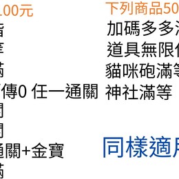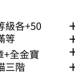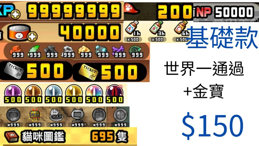 基礎款 罐頭40000 xp99999999 貓眼石各500 喵力達各500 金卷500 銀卷999 素材各1000 首領旗200 道具各999 可買帳號,也可以把你的帳號給我改
