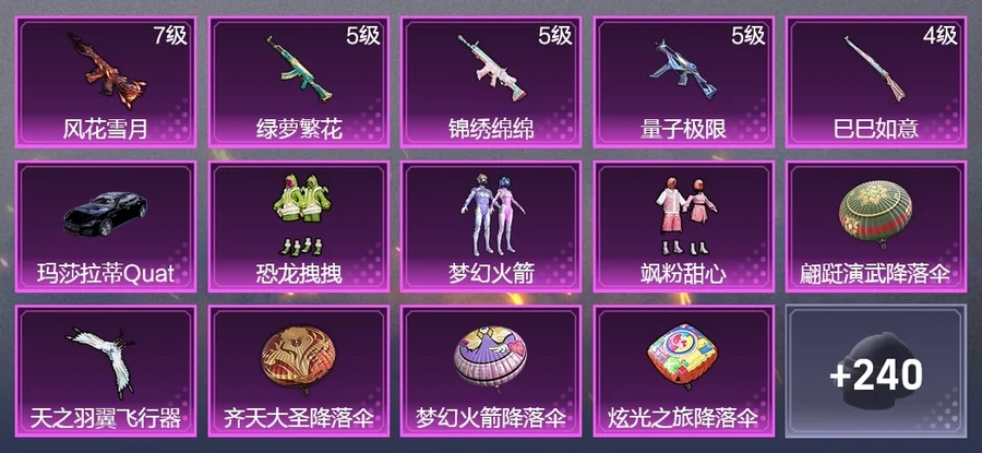 萌酷奶龍降落傘,夢幻火箭降落傘,輝耀戰甲降落傘,創世·救贖降落傘,翩躚演武降落傘,蓮影清波降落傘,電糖天使降落傘,繁龍極客降落傘,守護天翼降落傘,齊天大聖降落傘,炫光之旅降落傘,萌物絨絨飛行器,天之羽翼飛行器