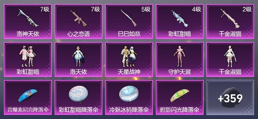 M416-心之戀語,Kar98K-巳巳如意,M249-彩虹甜喵,DP-28-千金淑貓,MG3-洛神天依,AKM-江南煙雨,AKM-虎虎生威,AKM-夜燈,AKM-繽紛海域,AKM-熒星靈貓,AKM-霓虹街區,AKM-龍的傳人,AKM-萌趣顏糰子,AKM-冰涼西瓜,AKM-彩虹符號,M16A4-冰河戰士,M16A4-幻世戰舞者,M16A4-千金淑貓,M16A4-甜心亞夢,SCAR-L-海鹽豹豹,SCAR-L-星途旅人,SCAR-L-玉兔迎春,SCAR-L-紅色方程式,M416-藍色火焰,M416-紅色方程式,M416-糯團青竹,M416-緋紅前夜,GROZA-守護天翼,GROZA-異彩先驅,GROZA-春暖花開,GROZA-懵萌河馬,GROZA-緋紅回憶,GROZA-田園牧歌,GROZA-海鹽豹豹,AUG-耀粉歌者,AUG-青春冒險家,AUG-天降萌嘰,QBZ-洛神天依,QBZ-未來歌姬,QBZ-純真浪花,QBZ-飛馳魅影,M762-彩虹符號,M762-彩虹甜喵,M762-天降萌嘰,M762-雛菊兔兔,M762-暗夜鎏金,Mk47-妙紅點點,Mk47-炫光之旅,Mk47-烏木金紋,G36C-懵萌河馬,G36C-桃粉嫣然,AC-VAL-烏木金紋,AC-VAL-甜心亞夢,AC-VAL-快閃甜心,AC-VAL-天降萌嘰,AC-VAL-彩虹甜喵,蜜獾-糖糖葫蘆,蜜獾-嬌憨豬豬,蜜獾-天降萌嘰,Kar98K-紅色方程式,Kar98K-洛神天依,Kar98K-王子的夏天,Kar98K-頂峰精英,Kar98K-飛馳魅影,M24-炫彩節奏,AWM-純真浪花,AWM-焰鷹斗篷,Win94-蘿蘿小趴兔,Win94-拳皇·狂花道,莫辛納甘-烏木金紋,莫辛納甘-懵萌河馬,AMR-妙紅點點,M200-仲夏莫吉托,M200-驚鴻俠骨,SKS-糯團青竹,SKS-未來歌姬,SKS-青丘仙客,SKS-炫彩節奏,SKS-迅猛狂鯊,VSS-香桃花海,VSS-田園牧歌,VSS-彩虹符號,Mini14-穿刺龍蝦,Mini14-塗山之戀,Mini14-香桃花海,Mini14-雛菊兔兔,Mini14-異彩先驅,Mini14-耀粉歌者,Mk14-烏木金紋,Mk14-冰河戰士,SLR-彩虹符號,SLR-嬌憨豬豬,SLR-守護天翼,QBU-颯粉甜心,M417-星兔領航員,M417-驚鴻俠骨,MK20-H-星途旅人,MK20-H-糖糖葫蘆,MK20-H-快閃甜心,UZI-啾咪啾咪,UZI-天降萌嘰,UZI-冰河戰士,UZI-炫彩節奏,UZI-詭夜天鵝,UZI-嬌憨豬豬,UMP45-詭娃娃,UMP45-塗山之戀,UMP45-炫光之旅,UMP45-糖糖葫蘆,UMP45-藍色火焰,Vector-燕燕於飛,Vector-暗夜玫瑰,Vector-音爆索尼克,Vector-生命誓言,Vector-田園牧歌,Vector-焰鷹斗篷,Vector-彩虹符號,湯姆遜-純真浪花,湯姆遜-異彩先驅,湯姆遜-耀粉歌者,湯姆遜-炫彩節奏,湯姆遜-天降萌嘰,湯姆遜-暗夜鎏金,野牛-雛菊兔兔,野牛-燕燕於飛,MP5K-異彩先驅,P90-傾城蜜語,P90-飛馳魅影,P90-巳巳如意,P90-玩趣呆呆,P90-快閃甜心,S686-千金淑貓,S686-紅色方程式,S686-彩虹符號,S686-巳巳如意,S1897-炫彩節奏,S1897-飛馳魅影,S12K-香水檸檬,S12K-守護天翼,S12K-玩趣呆呆,S12K-幻世戰舞者,S12K-嬌憨豬豬,DBS-焰鷹斗篷,DBS-歌者泠鳶,DBS-聖堂之誓,DBS-彩虹甜喵,DBS-甜心亞夢,AA12-G-純真浪花,SPAS-12-燕燕於飛,SPAS-12-田園牧歌,M249-糯團青竹,M249-彩虹符號,M249-妙紅點點,M249-金豐海韻,DP-28-甜心亞夢,DP-28-焰鷹斗篷,MG3-妙紅點點,MG3-幻世戰舞者,MG3-驚鴻俠骨,MG3-烏木金紋,PKM-懵萌河馬,R1895-鐳金極速,R1895-雛菊兔兔,P18C-糖糖葫蘆,蠍式手槍-燕燕於飛,蠍式手槍-千金淑貓,蠍式手槍-閒夢青纓,沙漠之鷹-快閃甜心,TMP-9-江南煙雨,大砍刀-2P戰鬥服款,撬棍-幻世戰舞者,平底鍋-飛馳魅影,平底鍋-驚鴻俠骨,平底鍋-嬌憨豬豬,平底鍋-空投萌嘰,平底鍋-異彩先驅,平底鍋-快閃甜心,平底鍋-光之冒險,平底鍋-妙紅點點,平底鍋-雛菊兔兔,平底鍋-懵萌河馬,平底鍋-精靈夢葉羅麗,平底鍋-純真浪花,平底鍋-田園牧歌,平底鍋-空島之星,平底鍋-糖糖葫蘆,平底鍋-焰鷹斗篷,平底鍋-甜心亞夢,十字弩-燕燕於飛,戰術弩-江南煙雨,爆炸獵弓-驚鴻俠骨,突擊盾牌-初號機 覺醒Ver.,破片手榴彈-星途旅人,破片手榴彈-呆爆全場,破片手榴彈-巳巳如意,破片手榴彈-萌趣顏糰子