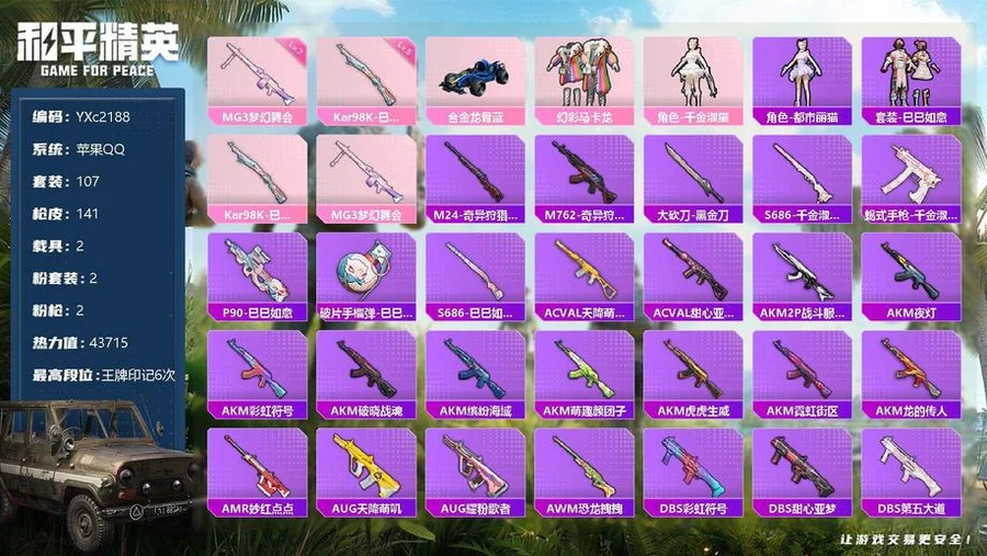 508-[]〖保證金商家·終身售後·找回賠〗-c2188-〖可二次〗-〖因賽季更新遊戲段付以上號為準!〗 蘋果-熱力值 6王牌印記 歷史超級王牌7星 107套裝 141槍皮 〖2載具〗 星河領航(磐石銀) 合金龍骨藍色 〖1稀有〗 AKM-繽紛海域 〖2粉裝〗 千金淑貓 幻彩馬卡龍 〖2特效槍〗 Kar98K-巳巳如意 (5級) MG3-夢幻舞會 (7級) 〖10熱門〗 AG戰隊服 團圓交子 瑞