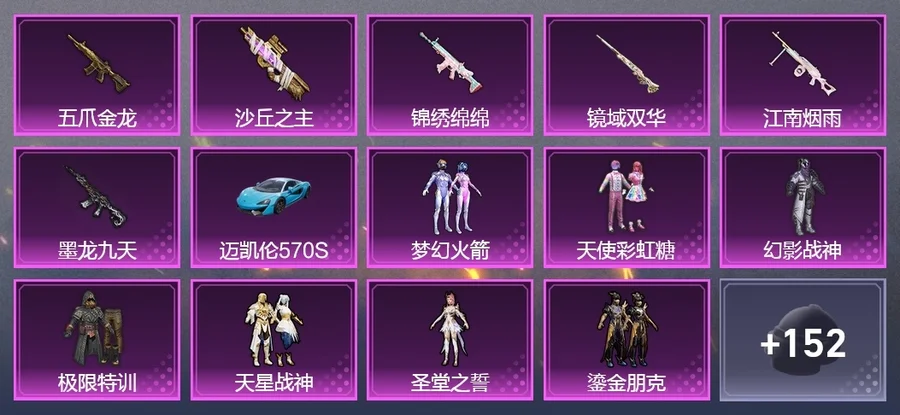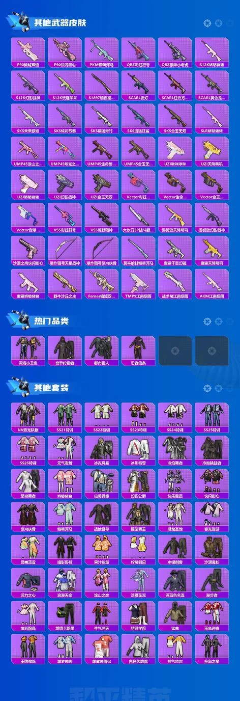 SCAR-L-錦繡綿綿,M416-五爪金龍,M416-墨龍九天,P90-沙丘之主,Kar98K-夢幻火箭,M24-鏡域雙華,PKM-江南煙雨,AKM-2P戰鬥服款,AKM-江南煙雨,M416-詭夜天鵝,GROZA-影襲,GROZA-恐龍拽拽,GROZA-懵萌河馬,AUG-幻影戰神,AUG-耀粉歌者,AUG-詭面斬,QBZ-銀碳小老虎,M762-彩虹甜喵,M762-甜心寶貝,Mk47-摩登王國,Mk47-炫光之旅,G36C-懵萌河馬,AC-VAL-快閃甜心,蜜獾-千面幻鏡,蜜獾-嬌憨豬豬,Famas-鏡域雙華,Famas-墨龍九天,UZI-嬌憨豬豬,UZI-幻影戰神,UZI-金玉無雙,UMP45-炫光之旅,UMP45-金玉無雙,Vector-焰鷹斗篷,Vector-金玉無雙,Vector-音爆索尼克,湯姆遜-幻影戰神,野牛-沙丘之主,P90-快閃甜心,Kar98K-幻影戰神,Kar98K-黑白懵懵牛,M24-拂曉神騎,AWM-焰鷹斗篷,AWM-恐龍拽拽,SKS-未來歌姬,SKS-迅猛狂鯊,SKS-金玉無雙,VSS-荒野獵神,Mini14-夢幻火箭,Mini14-穿刺龍蝦,Mini14-金玉無雙,SLR-嬌憨豬豬,SLR-墨龍九天,莫辛納甘-懵萌河馬,AMR-鏡光幻境,AMR-墨龍九天,M417-驚鴻俠骨,MK20-H-快閃甜心,MK20-H-蓮影清波,M200-驚鴻俠骨,M200-綠野極光,S686-奇異狩獵者,S1897-暗夜鎏金,S12K-嬌憨豬豬,S12K-幻影戰神,DBS-焰鷹斗篷,M249-沙丘之主,M249-詭夜天鵝,DP-28-焰鷹斗篷,DP-28-甜心寶貝,MG3-驚鴻俠骨,PKM-懵萌河馬,TMP-9-江南煙雨