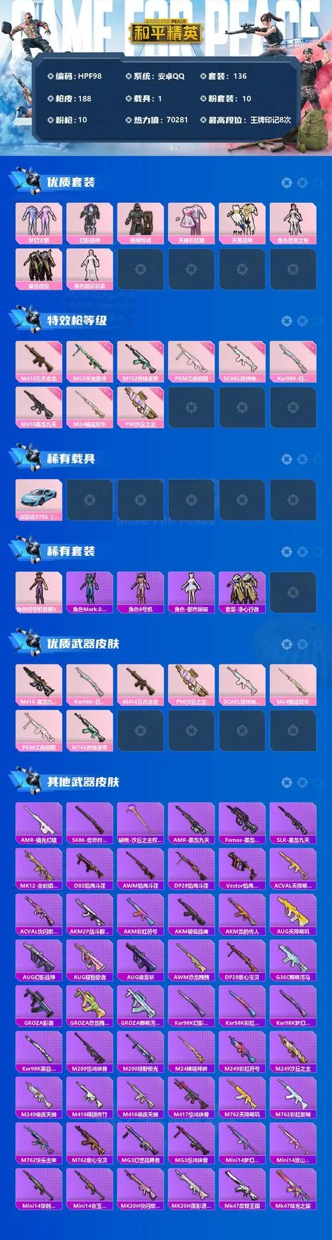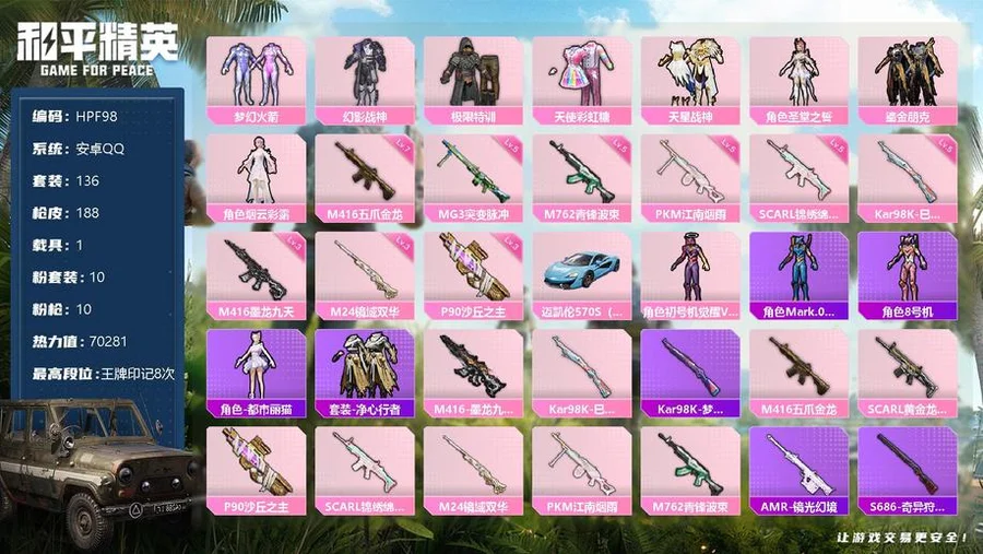 【商品標題】:安卓 手Q-10粉裝-10特效槍-1載具-70281熱力值-0印記-136套裝-188槍皮