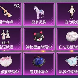 神秘黑貓降落傘,蜜語絨貓降落傘,晶夢幻蝶降落傘,拳皇·狂花道降落傘,櫻桃泡泡降落傘,白勺歌姬降落傘,千金淑貓降落傘,鬼刀降落傘
