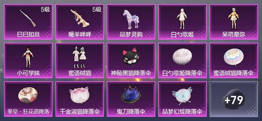AUG-暖羊咩咩,Kar98K-巳巳如意,M16A4-冰河戰士,SCAR-L-拳皇·狂花道,SCAR-L-星途旅人,GROZA-晶夢幻蝶,QBZ-神秘黑貓,M762-雛菊兔兔,M762-彩虹符號,G36C-懵萌河馬,AC-VAL-甜心亞夢,蜜獾-糖糖葫蘆,Kar98K-頂峰精英,Win94-晶夢幻蝶,AMR-鬼刀,AMR-白勺歌姬,VSS-香桃花海,Mini14-香桃花海,Mini14-雛菊兔兔,Mini14-耀粉歌者,Mk14-冰河戰士,MK20-H-星途旅人,MK20-H-糖糖葫蘆,UZI-嬌憨豬豬,UZI-冰河戰士,UMP45-糖糖葫蘆,UMP45-絨寶小鵝,UMP45-生命誓言,Vector-燕燕於飛,湯姆遜-櫻桃泡泡,野牛-雛菊兔兔,野牛-燕燕於飛,AKS-74U-鬼刀,P90-巳巳如意,S686-巳巳如意,S686-白勺歌姬,S1897-神秘黑貓,SPAS-12-燕燕於飛,PKM-懵萌河馬,PKM-啾咪啾咪,R1895-雛菊兔兔,P18C-糖糖葫蘆,蠍式手槍-燕燕於飛,平底鍋-糖糖葫蘆,平底鍋-雛菊兔兔,十字弩-燕燕於飛,爆炸獵弓-雪月幻音,破片手榴彈-星途旅人,破片手榴彈-巳巳如意