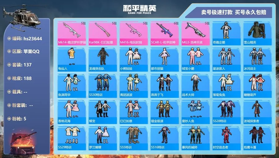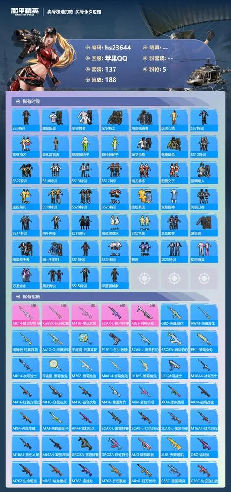SCAR-L-機甲封神,M416-電玩時刻,Kar98K-巳巳如意,Mk14-精靈夢葉羅麗,MG3-洛神天依,AKM-冰涼西瓜,AKM-熒星靈貓,AKM-彩虹符號,AKM-虎虎生威,AKM-破曉戰魂,AKM-萌趣顏糰子,AKM-霓虹街區,M16A4-紅色方程式,M16A4-藍色火焰,M16A4-冰河戰士,M16A4-凝視深淵,SCAR-L-星途旅人,SCAR-L-炫彩節奏,SCAR-L-海鹽豹豹,SCAR-L-紅色方程式,SCAR-L-雷霆特警,M416-紅色方程式,M416-藍色火焰,M416-倉鼠灰灰,M416-糯團青竹,GROZA-海鹽豹豹,GROZA-彩虹符號,GROZA-雷霆特警,AUG-天降萌嘰,AUG-耀粉歌者,QBZ-純真浪花,QBZ-詭娃娃,M762-生命誓言,M762-摺紙暴龍,M762-雛菊兔兔,M762-瑞龍福將,M762-詭娃娃,Mk47-百萬伏特,G36C-時空追擊者,G36C-雪國精靈,AC-VAL-快閃甜心,AC-VAL-天降萌嘰,蜜獾-天降萌嘰,蜜獾-糖糖葫蘆,Kar98K-彩虹符號,Kar98K-勇闖險境,Kar98K-頂峰精英,Kar98K-王子的夏天,M24-冰封烈焰,AWM-焰鷹斗篷,AWM-天降萌嘰,AWM-純真浪花,Win94-瑞龍福將,Win94-夏日綿綿冰,莫辛納甘-烏木金紋,莫辛納甘-鐳金極速,SKS-玉龍,SKS-迅猛狂鯊,SKS-時空追擊者,SKS-夜燈,SKS-詭娃娃,SKS-勇闖險境,VSS-香桃花海,VSS-雷霆特警,VSS-星之彼岸,Mini14-雛菊兔兔,Mini14-香桃花海,Mini14-穿刺龍蝦,Mini14-鐳金極速,Mini14-炫彩節奏,Mini14-金鼠迎春,Mk14-暗星紫秘,Mk14-冰河戰士,Mk14-烏木金紋,SLR-葫蘆兄弟,M417-藍晶綺麟,MK20-H-星途旅人,MK20-H-糖糖葫蘆,MK20-H-快閃甜心,UZI-小丑,UZI-炫彩節奏,UZI-魔法學院,UZI-生命誓言,UZI-冰河戰士,UZI-啾咪啾咪,UMP45-詭娃娃,UMP45-時空追擊者,UMP45-糖糖葫蘆,UMP45-夜燈,UMP45-生命誓言,UMP45-絨寶小鵝,Vector-燕燕於飛,Vector-生命誓言,Vector-焰鷹斗篷,湯姆遜-純真浪花,湯姆遜-勇闖險境,野牛-燕燕於飛,野牛-雛菊兔兔,MP5K-颯粉甜心,P90-快閃甜心,P90-巳巳如意,P90-玩趣呆呆,S686-生命誓言,S686-巳巳如意,S686-冰封烈焰,S686-彩虹符號,S1897-春暖花開,S1897-勇闖險境,S1897-神秘黑貓,S12K-瑞龍福將,S12K-破曉戰魂,S12K-PEL轟鳴競夢者,DBS-聖堂之誓,DBS-焰鷹斗篷,DBS-彩虹符號,DBS-時空追擊者,AA12-G-純真浪花,SPAS-12-燕燕於飛,M249-破曉戰魂,M249-百萬伏特,M249-彩虹符號,DP-28-焰鷹斗篷,DP-28-清新檸檬,MG3-瑞龍福將,MG3-幻世戰舞者,P92-雷霆特警,P1911-創世·救贖,P1911-冰封烈焰,R1895-雛菊兔兔,R1895-鐳金極速,P18C-糖糖葫蘆,短管霰彈-竹節火銃,蠍式手槍-歡樂香蕉,蠍式手槍-燕燕於飛,沙漠之鷹-快閃甜心,大砍刀-粉色回憶,撬棍-雪國精靈,撬棍-緋紅前夜,撬棍-傳奇偵探,平底鍋-時空追擊者,平底鍋-糖糖葫蘆,平底鍋-快閃甜心,平底鍋-冰封烈焰,平底鍋-繽紛糖果,平底鍋-勇闖險境,平底鍋-瑞龍福將,平底鍋-火吻草莓,平底鍋-雛菊兔兔,平底鍋-空投萌嘰,平底鍋-雷霆特警,平底鍋-焰鷹斗篷,平底鍋-詭娃娃,平底鍋-空島之星,平底鍋-純真浪花,十字弩-燕燕於飛,破片手榴彈-萌趣顏糰子,破片手榴彈-呆爆全場,破片手榴彈-星途旅人,破片手榴彈-巳巳如意