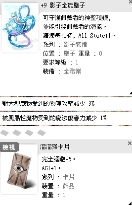 +9 影子全能墜子 對大型魔物受到物理攻擊-3%/對風屬魔物魔法傷害-1%