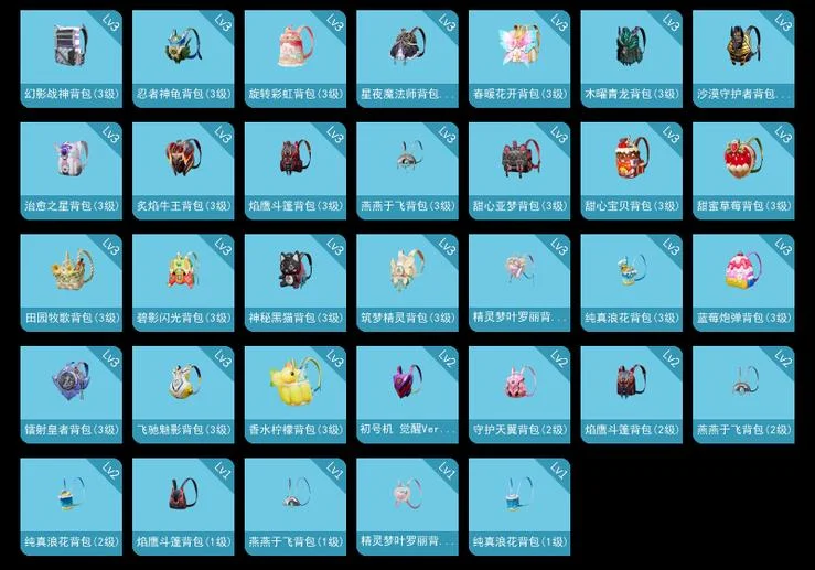 PEL轟鳴競夢者降落傘,冰川粉黛降落傘,創世·救贖降落傘,古堡領主降落傘,四聖煥新降落傘,天啟紀元降落傘,妙趣可麗降落傘,幻夢音符降落傘,快樂主宰降落傘,旋轉彩虹降落傘,星之彼岸降落傘,星夜魔法師降落傘,暗星紫秘降落傘,洛神天依降落傘,炫紫旋律降落傘,神秘黑貓降落傘,精靈夢葉羅麗降落傘,蜜語絨貓降落傘,銀刃賽羅降落傘,垂柳戲鴨降落傘,暗夜鎏金降落傘,未來戰士降落傘,炙焰牛王降落傘,香水檸檬降落傘,PEL轟鳴競夢者飛行器,星夜魔法師飛行翼