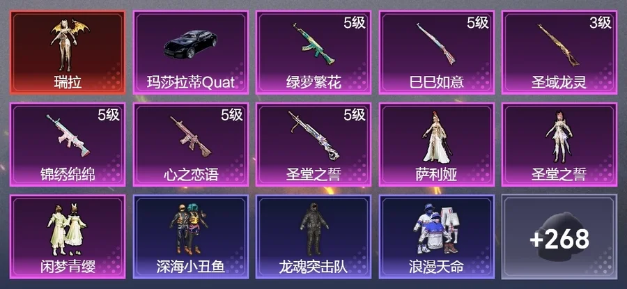 AKM-綠蘿繁花,SCAR-L-錦繡綿綿,M416-心之戀語,Kar98K-聖域龍靈,Kar98K-巳巳如意,DP-28-聖堂之誓,AKM-龍的傳人,AKM-彩虹符號,AKM-霓虹街區,AKM-虎虎生威,AKM-破曉戰魂,M16A4-幻世戰舞者,M16A4-甜心亞夢,M16A4-紅色方程式,SCAR-L-紅色方程式,SCAR-L-玉兔迎春,SCAR-L-海鹽豹豹,M416-藍色火焰,M416-糯團青竹,GROZA-異彩先驅,GROZA-田園牧歌,AUG-流星咚咚,AUG-靈符少年,AUG-天降萌嘰,AUG-月影靈韻,QBZ-飛馳魅影,QBZ-彩虹符號,M762-天降萌嘰,M762-瑞龍福將,Mk47-烏木金紋,AC-VAL-快閃甜心,AC-VAL-彩虹甜喵,AC-VAL-甜心亞夢,蜜獾-精靈夢葉羅麗,蜜獾-嬌憨豬豬,蜜獾-天降萌嘰,蜜獾-垂柳戲鴨,Kar98K-炫彩節奏,Kar98K-彩虹符號,Kar98K-飛馳魅影,M24-炫彩節奏,AWM-聖堂之誓,AWM-不夜海上花,Win94-瑞龍福將,莫辛納甘-炙焰牛王,莫辛納甘-烏木金紋,AMR-暗夜行者,AMR-墨龍九天,M200-仲夏莫吉托,M200-驚鴻俠骨,SKS-聖域龍靈,SKS-炫彩節奏,VSS-田園牧歌,VSS-香桃花海,Mini14-築夢精靈,Mini14-異彩先驅,Mk14-豬豬俠,Mk14-烏木金紋,SLR-嬌憨豬豬,M417-豬豬俠,M417-驚鴻俠骨,MK20-H-快閃甜心,MK20-H-聖域龍靈,UZI-天降萌嘰,UZI-影襲,UZI-紅色方程式,UZI-啾咪啾咪,UZI-炫彩節奏,UZI-嬌憨豬豬,UMP45-靈符少年,UMP45-生命誓言,UMP45-豬豬俠,Vector-生命誓言,Vector-暗夜玫瑰,Vector-燕燕於飛,Vector-田園牧歌,湯姆遜-異彩先驅,湯姆遜-環太平洋,湯姆遜-耀粉歌者,野牛-燕燕於飛,MP5K-藍莓炮彈,MP5K-異彩先驅,P90-築夢精靈,P90-飛馳魅影,P90-快閃甜心,S686-紅色方程式,S1897-飛馳魅影,S1897-炫彩節奏,S12K-垂柳戲鴨,S12K-嬌憨豬豬,S12K-幻世戰舞者,S12K-瑞龍福將,S12K-香水檸檬,DBS-彩虹甜喵,DBS-聖堂之誓,DBS-甜心亞夢,SPAS-12-田園牧歌,SPAS-12-燕燕於飛,M249-彩虹符號,M249-破曉戰魂,M249-糯團青竹,DP-28-甜心亞夢,MG3-摩登王國,MG3-幻世戰舞者,MG3-驚鴻俠骨,MG3-瑞龍福將,MG3-鏡域雙華,MG3-烏木金紋,短管霰彈-聖域龍靈,蠍式手槍-燕燕於飛,沙漠之鷹-快閃甜心,沙漠之鷹-旋轉彩虹,撬棍-幻世戰舞者,撬棍-沙丘之主權杖,平底鍋-嬌憨豬豬,平底鍋-飛馳魅影,平底鍋-田園牧歌,平底鍋-驚鴻俠骨,平底鍋-光之冒險,平底鍋-甜心亞夢,平底鍋-瑞龍福將,平底鍋-火吻草莓,平底鍋-快閃甜心,平底鍋-異彩先驅,平底鍋-空島之星,十字弩-燕燕於飛,爆炸獵弓-驚鴻俠骨,破片手榴彈-太空嘟嘟,破片手榴彈-呆爆全場