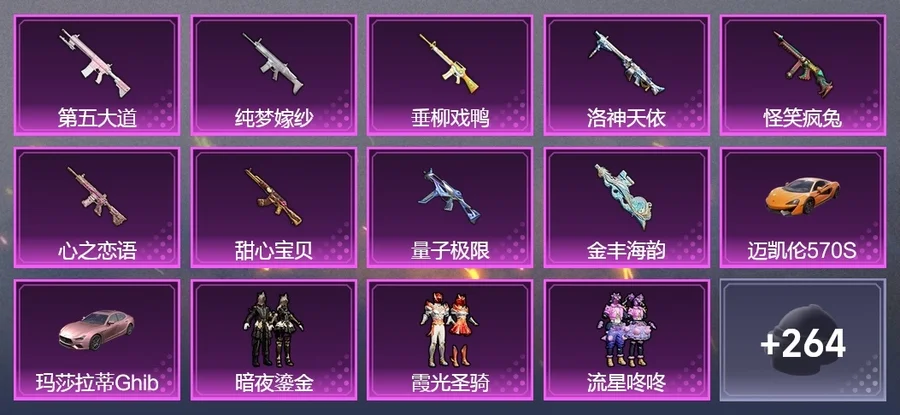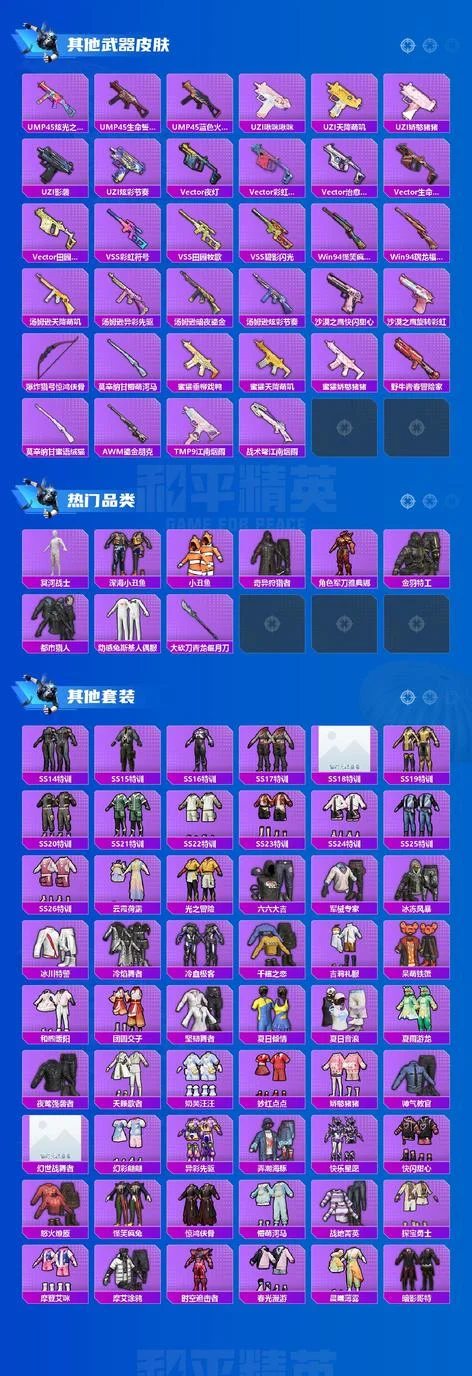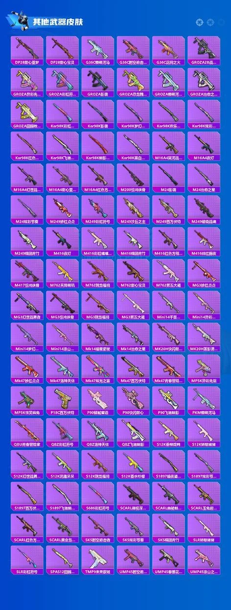 AKM-甜心寶貝,M16A4-垂柳戲鴨,SCAR-L-純夢嫁紗,M416-心之戀語,UMP45-量子極限,湯姆遜-怪笑瘋兔,P90-金豐海韻,Kar98K-夢幻火箭,M417-第五大道,MG3-洛神天依,AKM-影襲,AKM-星之彼岸,AKM-繽紛海域,AKM-萌趣顏糰子,M16A4-冥河戰士,M16A4-甜心亞夢,SCAR-L-凝視深淵,SCAR-L-幽秘魅影,M416-彩虹嘻嘻猴,M416-神秘黑貓,M416-緋紅前夜,GROZA-2B戰鬥服款,GROZA-異彩先驅,GROZA-影襲,GROZA-恐龍拽拽,GROZA-懵萌河馬,GROZA-治癒之星,GROZA-田園牧歌,AUG-凝視深淵,AUG-幻影戰神,AUG-靈符少年,AUG-耀粉歌者,AUG-閒夢青纓,AUG-青春冒險家,QBZ-洛神天依,QBZ-飛馳魅影,M762-奇異狩獵者,M762-瑞龍福將,M762-甜心寶貝,M762-第五大道,Mk47-妙紅點點,Mk47-洛神天依,Mk47-炫光之旅,Mk47-百萬伏特,Mk47-青春冒險家,G36C-懵萌河馬,G36C-時空追擊者,G36C-花間之火,AC-VAL-快閃甜心,AC-VAL-甜心亞夢,蜜獾-垂柳戲鴨,蜜獾-嬌憨豬豬,UZI-嬌憨豬豬,UZI-影襲,UMP45-時空追擊者,UMP45-春暖花開,UMP45-炫光之旅,Vector-焰鷹斗篷,Vector-治癒之星,Vector-田園牧歌,湯姆遜-奇異狩獵者,湯姆遜-異彩先驅,湯姆遜-暗夜鎏金,野牛-青春冒險家,MP5K-異彩先驅,MP5K-怪笑瘋兔,P90-快閃甜心,P90-飛馳魅影,Kar98K-影襲,Kar98K-歡樂麻醬,Kar98K-飛馳魅影,Kar98K-魅影蝠王,Kar98K-黑白懵懵牛,M24-影襲,M24-治癒之星,M24-奇異狩獵者,AWM-焰鷹斗篷,AWM-鎏金朋克,AWM-垂柳戲鴨,SKS-時空追擊者,VSS-田園牧歌,VSS-碧影閃光,Mini14-千面幻鏡,Mini14-異彩先驅,Mini14-夢幻火箭,Mk14-暗星紫秘,Mk14-治癒之星,Win94-怪笑瘋兔,Win94-瑞龍福將,SLR-嬌憨豬豬,QBU-青春冒險家,莫辛納甘-懵萌河馬,莫辛納甘-蜜語絨貓,AMR-妙紅點點,M417-驚鴻俠骨,MK20-H-快閃甜心,MK20-H-蓮影清波,M200-驚鴻俠骨,S1897-暗夜鎏金,S1897-百萬伏特,S1897-飛馳魅影,S12K-瑞龍福將,S12K-香水檸檬,S12K-垂柳戲鴨,S12K-嬌憨豬豬,DBS-焰鷹斗篷,DBS-聖堂之誓,DBS-時空追擊者,DBS-甜心亞夢,DBS-第五大道,SPAS-12-田園牧歌,M249-妙紅點點,M249-沙丘之主,M249-百萬伏特,DP-28-焰鷹斗篷,DP-28-甜心亞夢,DP-28-甜心寶貝,MG3-妙紅點點,MG3-驚鴻俠骨,MG3-瑞龍福將,MG3-第五大道,PKM-懵萌河馬,TMP-9-江南煙雨,TMP-9-未來歌姬