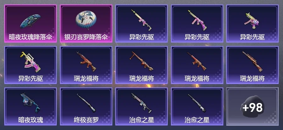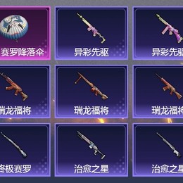 AKM-生命誓言,AKM-虎虎生威,AKM-破曉戰魂,AKM-夜燈,M16A4-幻世戰舞者,M16A4-藍色火焰,M16A4-紅色方程式,SCAR-L-海鹽豹豹,SCAR-L-紅色方程式,SCAR-L-炫彩節奏,SCAR-L-玉兔迎春,M416-紅色方程式,M416-藍色火焰,GROZA-異彩先驅,GROZA-彩虹符號,GROZA-治癒之星,AUG-耀粉歌者,AUG-天降萌嘰,QBZ-彩虹符號,M762-牛氣沖天,M762-瑞龍福將,Mk47-烏木金紋,AC-VAL-天降萌嘰,AC-VAL-烏木金紋,蜜獾-天降萌嘰,Kar98K-紅色方程式,Kar98K-終極賽羅,Kar98K-彩虹符號,M24-治癒之星,Win94-瑞龍福將,SKS-夜燈,Mini14-異彩先驅,Mini14-炫彩節奏,Mini14-金鼠迎春,Mini14-耀粉歌者,Mk14-治癒之星,Mk14-烏木金紋,UZI-炫彩節奏,UZI-天降萌嘰,UZI-紅色方程式,UMP45-生命誓言,UMP45-藍色火焰,Vector-暗夜玫瑰,Vector-治癒之星,Vector-生命誓言,Vector-彩虹符號,湯姆遜-炫彩節奏,湯姆遜-異彩先驅,湯姆遜-耀粉歌者,MP5K-異彩先驅,P90-玩趣呆呆,S686-紅色方程式,S1897-炫彩節奏,S12K-瑞龍福將,S12K-破曉戰魂,S12K-幻世戰舞者,M249-破曉戰魂,MG3-瑞龍福將,平底鍋-飛行日記,平底鍋-瑞龍福將,平底鍋-治癒之星,平底鍋-異彩先驅