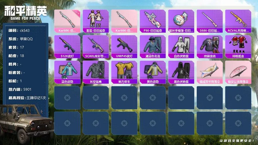 ck543-【商品標題】:蘋果 手Q-0粉裝-1特效槍-0載具-5901熱力值--1印記-17套裝-18槍皮