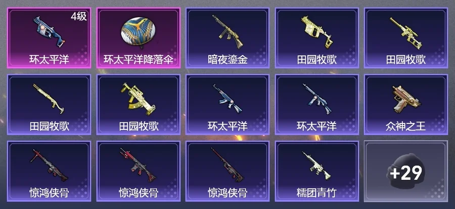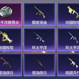 Vector-環太平洋,AKM-環太平洋,AKM-龍的傳人,M16A4-幻世戰舞者,SCAR-L-黃金龍骨,M416-紅色方程式,M416-糯團青竹,GROZA-田園牧歌,蜜獾-天降萌嘰,M200-驚鴻俠骨,VSS-田園牧歌,M417-驚鴻俠骨,UZI-眾神之王,UMP45-藍色火焰,Vector-田園牧歌,湯姆遜-環太平洋,湯姆遜-暗夜鎏金,SPAS-12-田園牧歌,M249-彩虹符號,MG3-驚鴻俠骨,MG3-烏木金紋,撬棍-環太平洋,平底鍋-田園牧歌,平底鍋-空島之星,平底鍋-驚鴻俠骨,爆炸獵弓-驚鴻俠骨