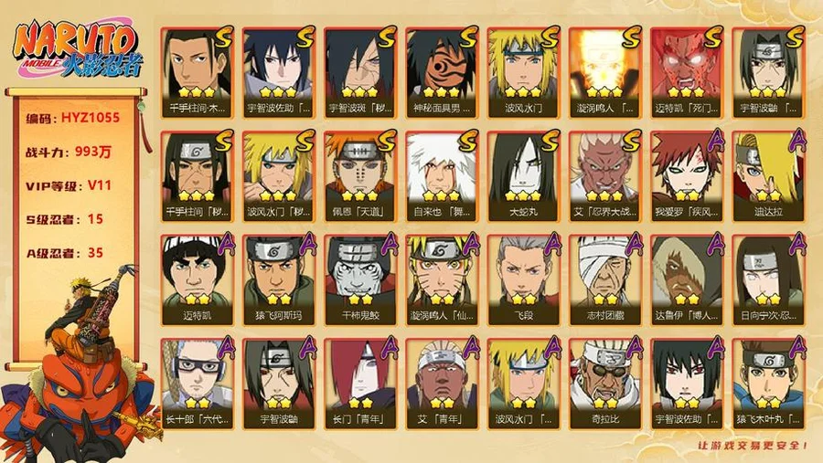 【HYZ1055】V11/戰力993W/S忍15/A忍35/水門/穢土水門/大蛇丸/死門凱/天道/創立柱間/穢土柱間/紅夜帶土/九鳴人/永恆萬花筒佐助/穢土解斑/須佐鼬/舞之豪傑自來也/忍戰艾/青年艾/青年水門/百豪櫻/迪達拉/博人傳達魯伊/穢土迪達拉/曉大蛇丸/飛段/惡靈飛段/鬼鮫/凱/奇拉比/忍戰奇拉比/漂泊扉間/忍戰丁次/近松十人衛千代/忍戰寧次/疾風傳我愛羅/桃式顯現博人/仙人鳴人/九尾鳴