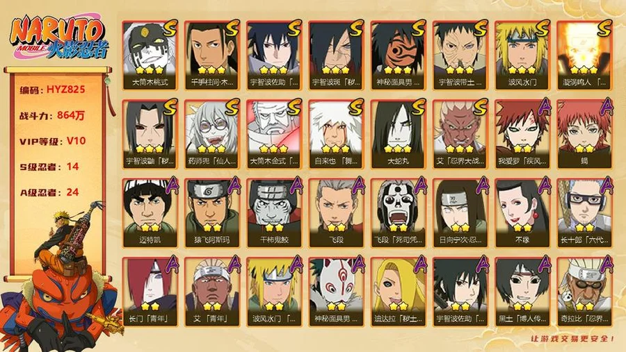 【HYZ825】V10/戰力864W/S忍14/A忍24/水門/博人傳桃式/金式/大蛇丸/創立柱間/紅夜帶土/九鳴人/永恆萬花筒佐助/穢土解斑/忍戰帶土/穢土鼬/仙人兜/舞之豪傑自來也/忍戰艾/青年艾/不緣/青年水門/穢土迪達拉/飛段/死司飛段/鬼鮫/博人傳黑土/凱/忍戰奇拉比/忍戰丁次/近松十人衛千代/忍戰寧次/忍者之路面具男/疾風傳我愛羅/桃式顯現博人/蠍/阿斯瑪/須佐佐助/最終章雛田/真容卡