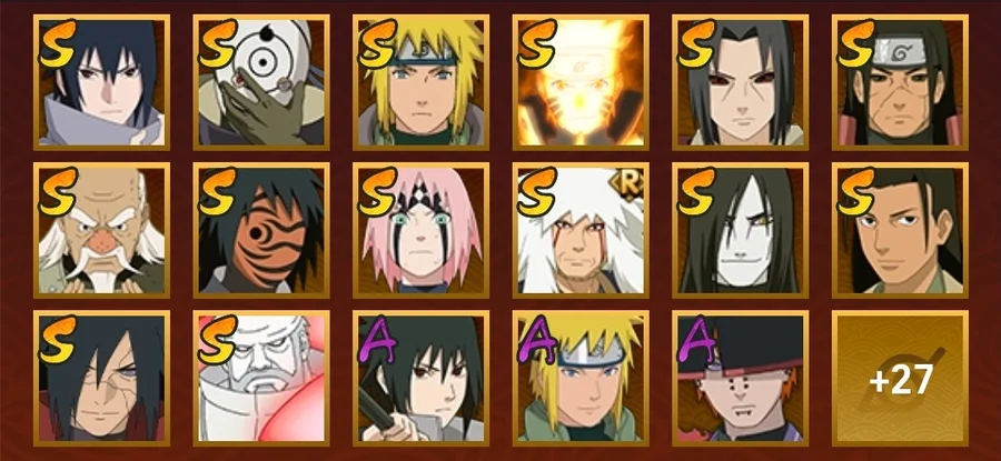 水門,忍戰櫻,忍戰大野木,金式,大蛇丸,創立柱間,穢土柱間,紅夜帶土,九喇嘛鳴人,永恆萬花筒佐助,穢土解斑,穢土鼬,舞之豪傑自來也,白面具,青年艾,青年水門,穢土迪達拉,曉大蛇丸,飛段,死司飛段,鬼鮫,俠隱綱手,博人傳黑土,角都,凱,漂泊六道,奇拉比,忍戰奇拉比,漂泊扉間,忍戰丁次,近松十人衛千代,忍戰寧次,疾風傳我愛羅,桃式顯現博人,蠍,漂泊小南,阿斯瑪,萬花筒佐助,須佐佐助,斗篷兜,真容卡卡西,六代水影,青年長門,五代水影