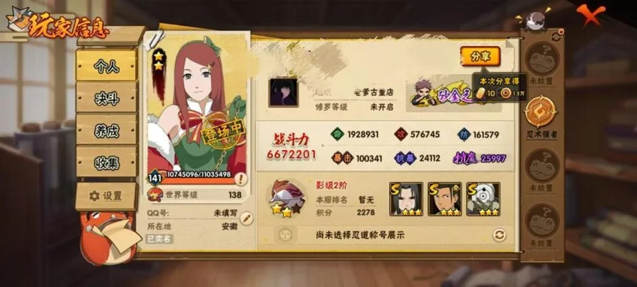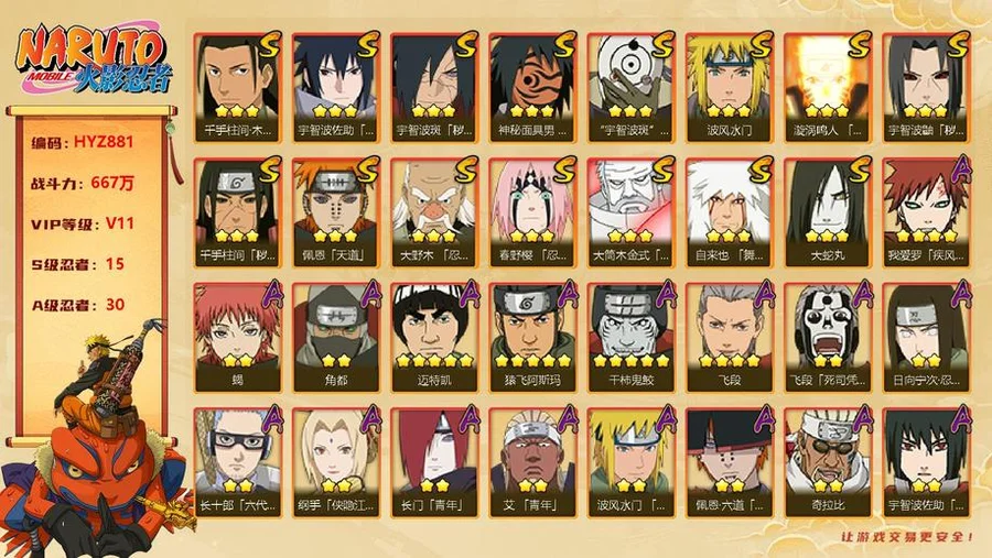 【HYZ881】V11/戰力667W/S忍15/A忍30/通靈獸16/水門/忍戰櫻/忍戰大野木/金式/大蛇丸/天道/創立柱間/穢土柱間/紅夜帶土/九鳴人/永恆萬花筒佐助/穢土解斑/穢土鼬/舞之豪傑自來也/白面具/青年艾/青年水門/穢土迪達拉/曉大蛇丸/飛段/死司飛段/鬼鮫/俠隱綱手/博人傳黑土/角都/凱/漂泊六道/奇拉比/忍戰奇拉比/漂泊扉間/忍戰丁次/近松十人衛千代/忍戰寧次/疾風傳我愛羅/桃式
