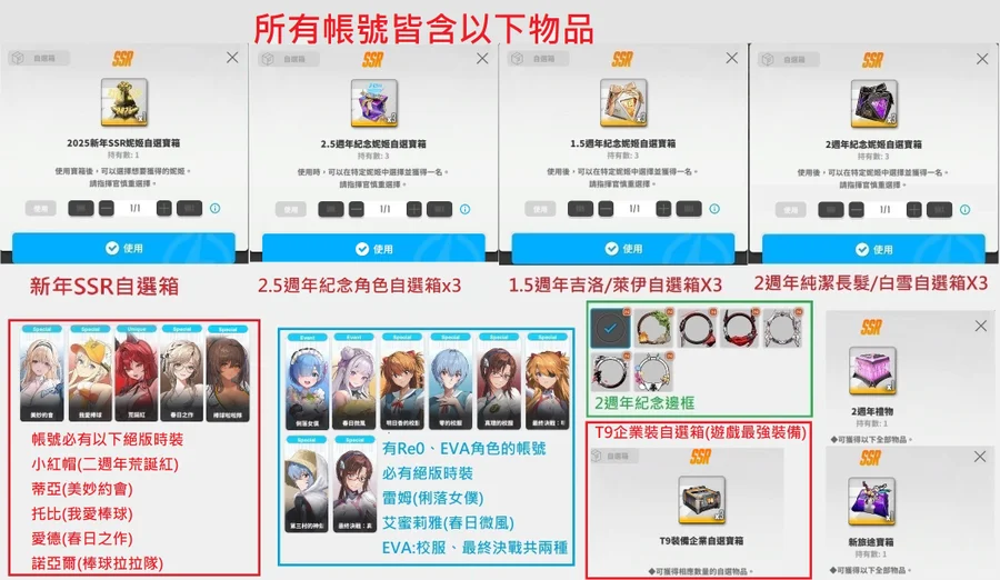 ^✨含35000鑽石+高級招募券x113+金票x226+企業T9裝自選箱x1(遊戲最強裝備)+自選SSR箱x1(可選露姬,完整輔助開局)