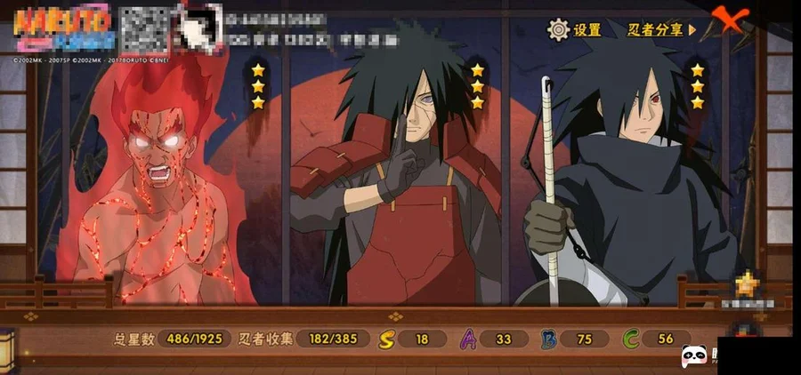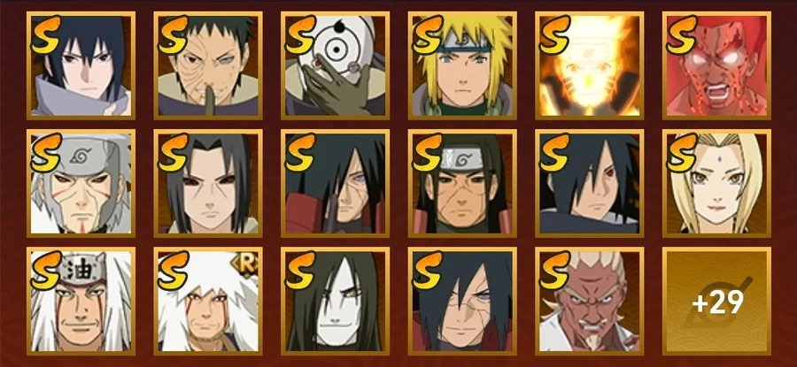 創立斑,九喇嘛鳴人,永恆萬花筒佐助,自來也,舞之豪傑自來也,大蛇丸,綱手,死門凱,水門,穢土扉間,穢土柱間,穢土斑,穢土解斑,穢土鼬,白面具,忍戰帶土,忍戰艾,凱,阿斯瑪,鬼鮫,疾風傳我愛羅,蠍,飛段,仙人鳴人,九尾鳴人,萬花筒佐助,須佐佐助,百豪櫻,忍戰丁次,忍戰寧次,青年日斬,青年水門,近松十人衛千代,五代水影,忍戰奇拉比,奇拉比,俠隱綱手,不風,不緣,青年長門,鼬,新春鼬,迪達拉,死司飛段,桃式顯現博人,六代水影