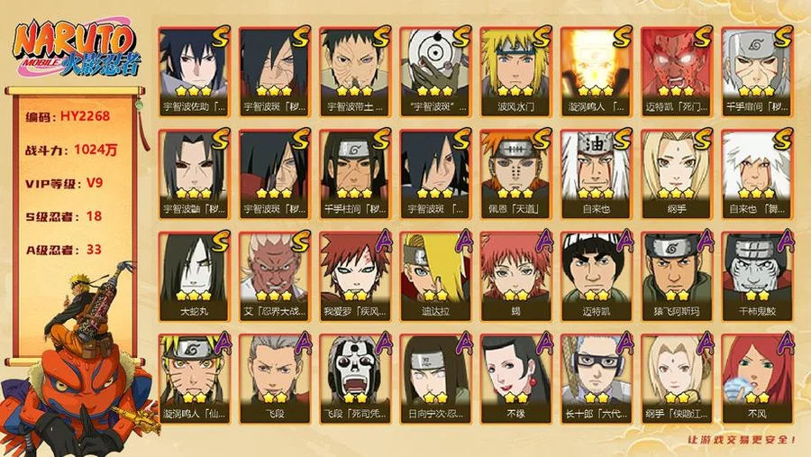 【HY2268】V9/戰力1024W/S忍18/A忍33/創立斑/九鳴人/永恆萬花筒佐助/自來也/舞之豪傑自來也/大蛇丸/綱手/死門凱/水門/穢土扉間/穢土柱間/穢土斑/穢土解斑/穢土鼬/白面具/忍戰帶土/忍戰艾/天道/凱/阿斯瑪/鬼鮫/疾風傳我愛羅/蠍/飛段/仙人鳴人/九尾鳴人/萬花筒佐助/須佐佐助/百豪櫻/忍戰丁次/忍戰寧次/2星李洛克「忍界大戰」/青年日斬/青年水門/近松十人衛千代/五代水影