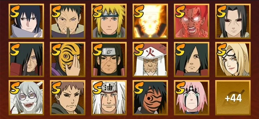 九喇嘛鳴人,永恆萬花筒佐助,忍戰櫻,自來也,舞之豪傑自來也,大蛇丸,百豪綱手,死門凱,水門,三代火影,創立柱間,穢土柱間,斑,穢土斑,穢土解斑,穢土鼬,須佐止水,神秘面具男,忍戰帶土,紅夜帶土,四代風影,忍戰艾,仙人兜,博人傳桃式,金式,凱,阿斯瑪,鬼鮫,疾風傳我愛羅,蠍,飛段,忍戰寧次,青年艾,青年長門,死司飛段,桃式顯現博人,忍者之路面具男,仙人鳴人,九尾鳴人,萬花筒佐助,須佐佐助,忍戰丁次,最終章雛田,真容卡卡西,止水,青年水門,新春我愛羅,近松十人衛千代,五代水影,奇拉比,忍戰奇拉比,俠隱綱手,漂泊扉間,小南,漂泊小南,曉大蛇丸,鼬,迪達拉,穢土迪達拉,新春迪達拉,六代水影