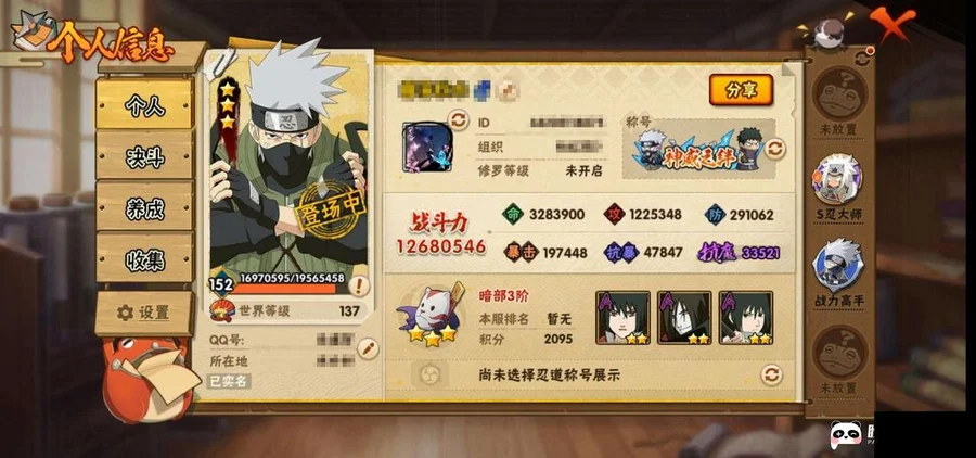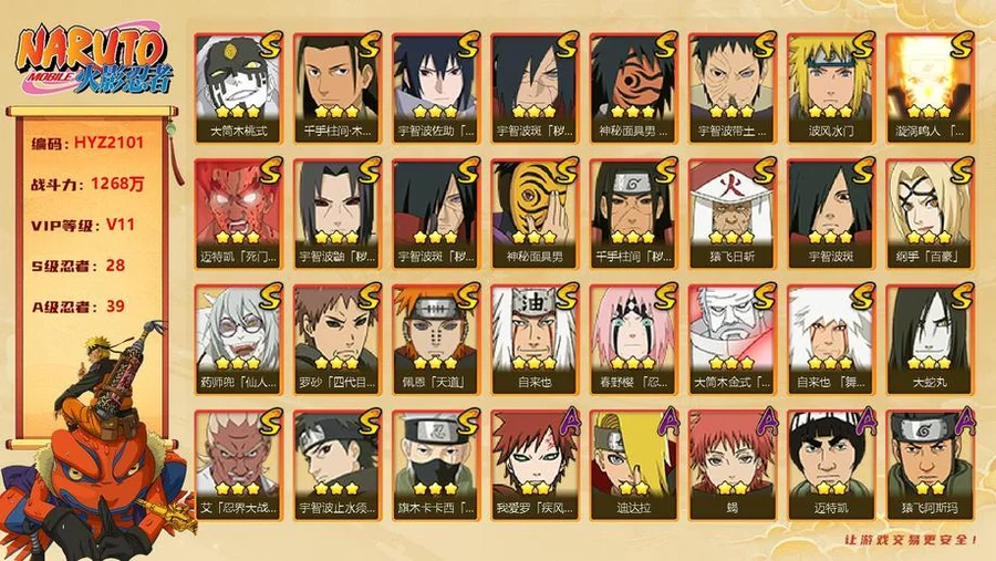 【HYZ2101】V11/戰力1268W/S忍28/A忍39/穢土斑/百豪綱手/俠隱綱手/疾風傳我愛羅/死司飛段/止水/3星旗木卡卡西「須佐能乎」/斑/新春我愛羅/五代水影/自來也/忍戰奇拉比/創立柱間/忍者之路面具男/四代風影/仙人兜/博人傳桃式/六代水影/死門凱/三代火影/穢土迪達拉/飛段/阿斯瑪/忍戰櫻/萬花筒佐助/迪達拉/小南/九尾鳴人/神秘面具男/曉大蛇丸/忍戰寧次/鼬/永恆萬花筒佐助/