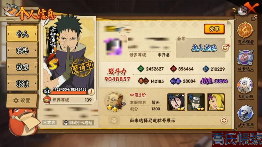 【OBHCRPR095342】戰鬥力:904W+;段位:中忍2階;本服排名:315;戰區排名:未上榜;VIP13級;S忍29個;A忍47個;通靈獸21個;S忍:穢土轉生宇智波斑,死門邁特凱,大筒木桃式,四代目風影羅砂,紅夜之刃神秘面具男,大筒木金式,忍界大戰艾,忍界大戰大野木,穢土轉生長門,舞之豪傑自來也,大蛇丸,天道佩恩,穢土轉生千手柱間,穢土轉生千手扉間,白面具宇智波斑,穢土轉生解宇智波斑,波風水門,須佐能乎宇智波鼬,二代目土影無,木葉創立宇智波斑,九喇嘛連結漩渦鳴人,忍界大戰春野櫻,永恆萬花筒宇智波佐助,穢土轉生猿飛日斬,忍界大戰宇智波帶土,傳說中的三忍自來也,穢土轉生波風水門,穢土轉生宇智波鼬,超佩恩天道;A忍:邁特凱,猿飛阿斯瑪,疾風傳我愛羅,幹柿鬼鮫,飛段,蠍,死司憑血飛段,仙人模式漩渦鳴人,忍者之路神秘面具男,九尾查克拉漩渦鳴人,萬花筒寫輪眼宇智波佐助,須佐能乎宇智波佐助,疾風傳咒印宇智波佐助,宇智波泉奈,忍界大戰秋道丁次,忍界大戰李洛克,最終章日向雛田,幻之真容旗木卡卡西,忍界大戰邁特凱,新春限定宇智波止水,新春限定波風水門,青年波風水門,忍界大戰我愛羅,近松十人衛千代,五代目水影照美冥,桃地再不斬,穢土轉生桃地再不斬,忍界大戰奇拉比,青年艾,俠隱江湖綱手,漂泊武士千手扉間,不風,青年長門,漂泊浪客佩恩六道,漂泊浪客小南,穢土轉生角都,曉大蛇丸,緋流琥蠍,宇智波鼬,迪達拉,穢土轉生迪達拉,暴怒宇智波帶土,羈絆神農,桃式顯現漩渦博人,六代目水影長十郎,五代目雷影達魯伊,四代目土影黑土;通靈獸:忍犬,藍蛇,蛤蟆吉,忍龜,砂之守鶴,鐮鼬,猿魔,熊貓,山椒魚,蜃,蛤蟆仙人,鮫鯊,蛞蝓,蛤蟆健,烏鴉,蛤蟆龍,蛞蝓俠隱江湖,蛤蟆廣,萬蛇,夢貘;時裝:百戰大蛇丸,百戰佩恩天道,百戰波風水門,蜀面豪傑舞之豪傑自來也,百戰宇智波鼬須佐能乎,太極靈韻日向花火武當宗師,冷玉豪情綱手俠隱江湖,龍的傳人李洛克截拳宗師,緋櫻綻放春野櫻百豪,血霧怪人幹柿鬼鮫,剎那的藝術迪達拉,編織虛實宇智波鼬,傳說的光芒波風水門,驕陽翠羽照美冥夏日泳裝;【532】【蘋果QQ】可轉生