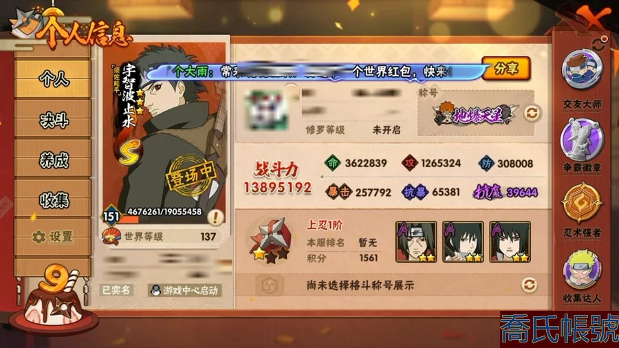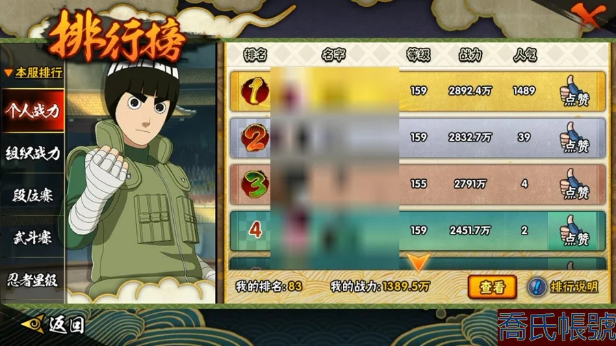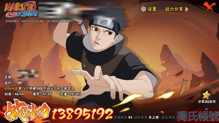 【OBHCRPR606542】戰鬥力:1389W+;段位:上忍1階;本服排名:83;戰區排名:未上榜;VIP12級;S忍26個;A忍32個;通靈獸22個;S忍:須佐能乎旗木卡卡西,穢土轉生解宇智波斑,須佐能乎宇智波止水,綱手,永恆萬花筒宇智波佐助,須佐能乎宇智波鼬,忍界大戰艾,木葉創立宇智波斑,波風水門,大筒木桃式,猿飛日斬,天道佩恩,白面具宇智波斑,大蛇丸,傳說中的三忍自來也,紅夜之刃神秘面具男,穢土轉生猿飛日斬,大筒木金式,忍界大戰大野木,神秘面具男,木葉創立千手柱間,最終章大筒木舍人,九喇嘛連結漩渦鳴人,自來也,舞之豪傑自來也,穢土轉生千手扉間;A忍:邁特凱,猿飛阿斯瑪,幹柿鬼鮫,蠍,疾風傳我愛羅,飛段,死司憑血飛段,萬花筒寫輪眼宇智波佐助,須佐能乎宇智波佐助,宇智波泉奈,忍界大戰秋道丁次,忍界大戰日向寧次,忍界大戰李洛克,最終章日向雛田,幻之真容旗木卡卡西,新春限定波風水門,青年波風水門,近松十人衛千代,奇拉比,青年艾,青年三船,漂泊浪客佩恩六道,小南,新春限定小南,漂泊浪客小南,穢土轉生角都,緋流琥蠍,宇智波鼬,新春限定宇智波鼬,迪達拉,桃式顯現漩渦博人,六代目水影長十郎;通靈獸:忍犬,藍蛇,蛤蟆吉,忍龜,砂之守鶴,鐮鼬,猿魔,山椒魚,蜃,蛤蟆仙人,蛞蝓,鮫鯊,蛤蟆健,烏鴉,熊貓,蛤蟆龍,怒鬼,蛤蟆廣,辛牙,萬蛇,夢貘;時裝:百戰波風水門,百戰宇智波鼬須佐能乎,蜀面豪傑舞之豪傑自來也,百戰佩恩天道,睿勇新星千手扉間少年,驚雷掠影達魯伊五代目雷影,緋櫻綻放春野櫻百豪,紅月映雪宇智波鼬新春限定,熊貓少女天天峨眉宗師,烈土霓裳黑土四代目土影,血霧怪人幹柿鬼鮫,傳說的光芒波風水門,土之固守大野木三代目土影,龍的傳人李洛克截拳宗師,飛瀑流泉長十郎六代目水影;【616】【蘋果QQ】可轉生